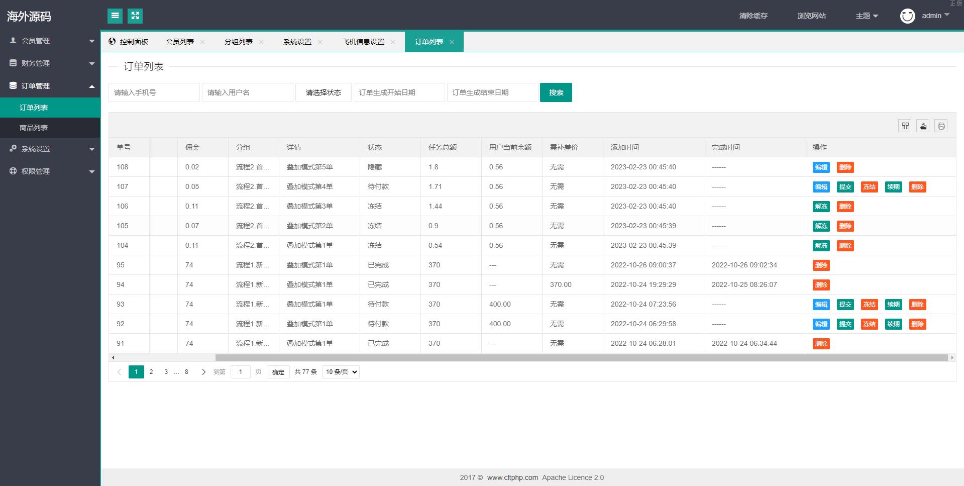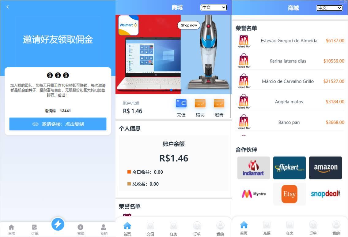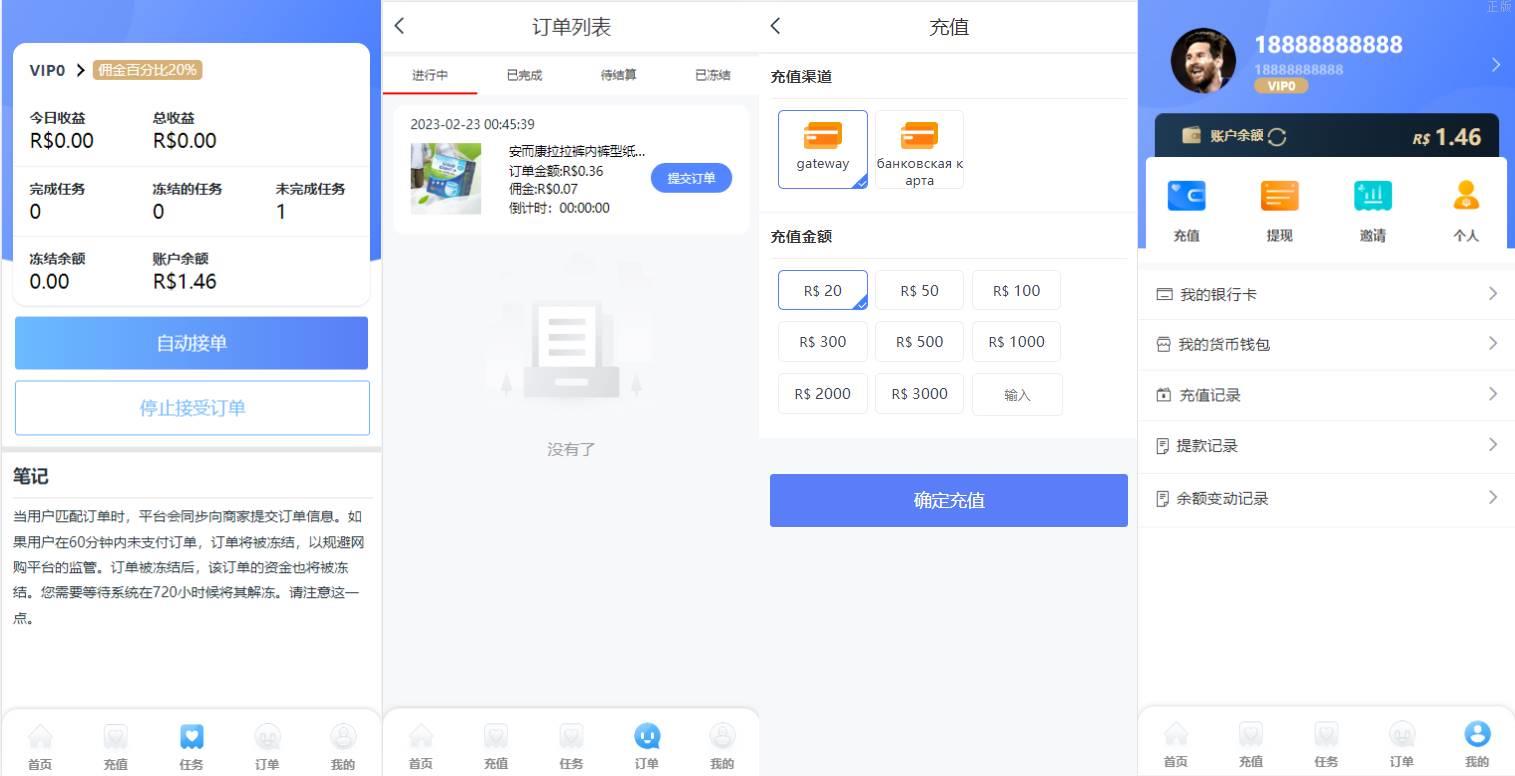 双UI多國語言特惠抢单刷單系统/分组派单/订单自动匹配系统 此套系统是别人全新二开的,非以往的框架开发 前端双套UI支持后台切换,多國語言支持切换设置默认语言(源码里附带多个语言包需要自己设置) 系统功能支持: 待结算:订单提交了不会马上结算,可以修改这个待结算,如果输入0那么订单提交了马上结算, 超时时间:订单匹配到在这个时间内没有提交会被冻结,冻结了没办法提交,只有后台手动解封 会员有分组时就按照分组里的规则派单,没有分组时按照会员等级匹配