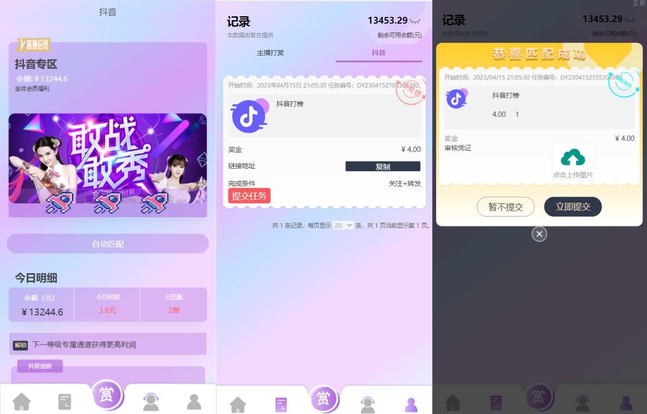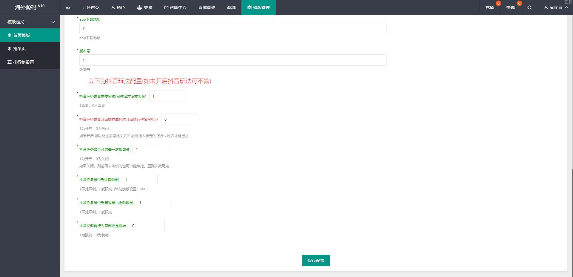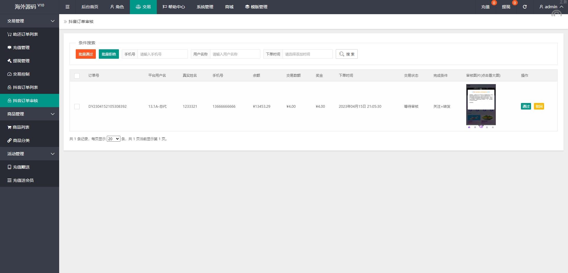 抖音刷單系统/抖音抢单刷單源码/手动自动抢单 此套刷單系统全新本,支持正常刷單玩法,后台可设置用户手动刷單跟自动刷單 手动刷單后台可设置用户订单金额等,新增了抖音玩法前端提交后台审核,系统新增多个功能 前端单中文,支持二开其他语言