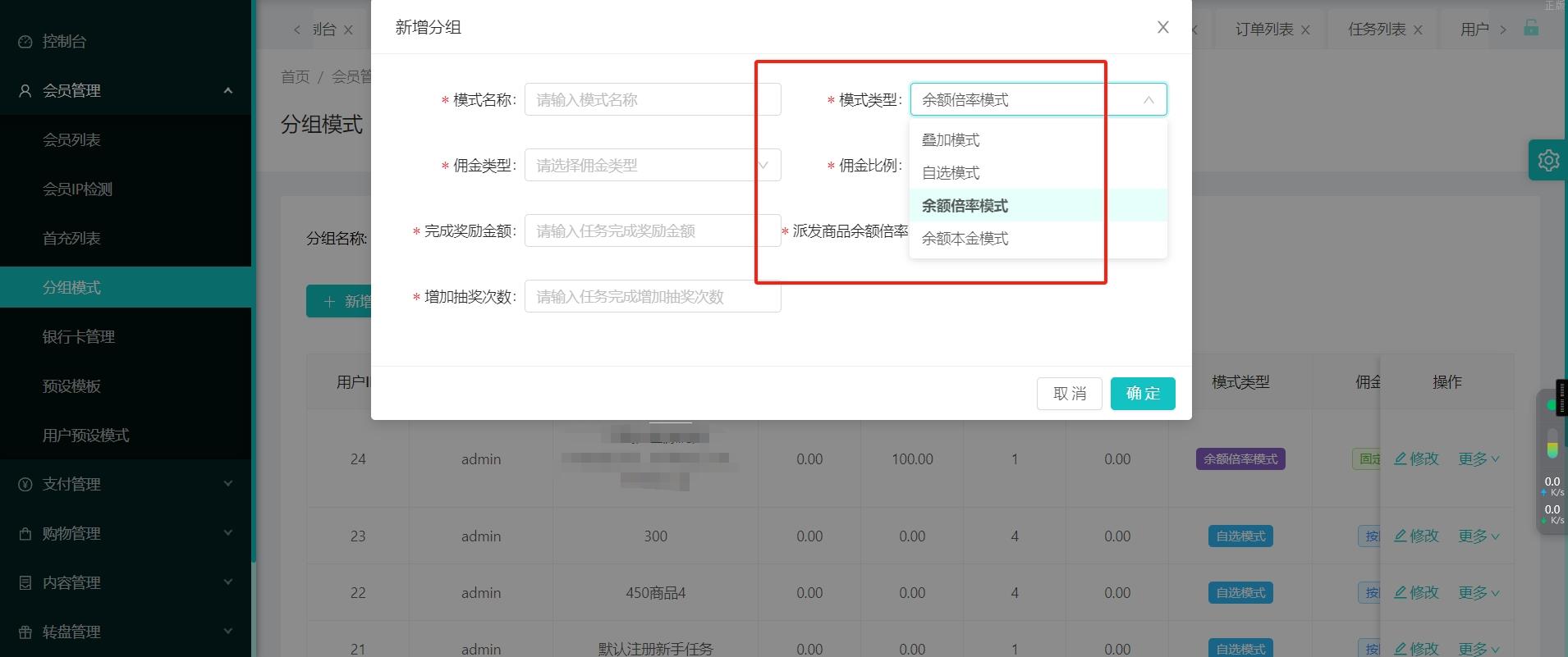 任务叠加模式、自选模式、余额倍率模式、余额本金模式 这几个模式就不详细介绍了,字面意思,和你们需要的那种功能一样