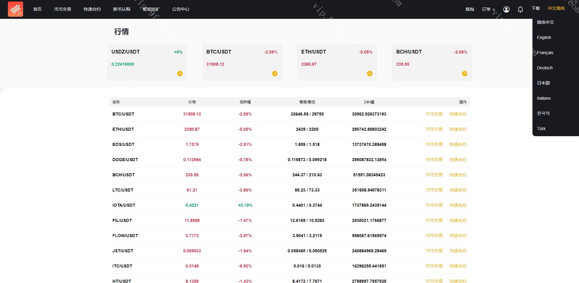 多國語言区块链交易所/币币交易/区块链矿机系统/区块链 多國語言区块链交易所/币币交易/区块链矿机系统/区块链,大概就是以前的矿机系统全新二开的 相当于整个系统的前端全部改变了,具体看下图 适用变现:精聊团队的最佳利器,完美运营 合适联系技术询价 编号:3121 付费精品源码