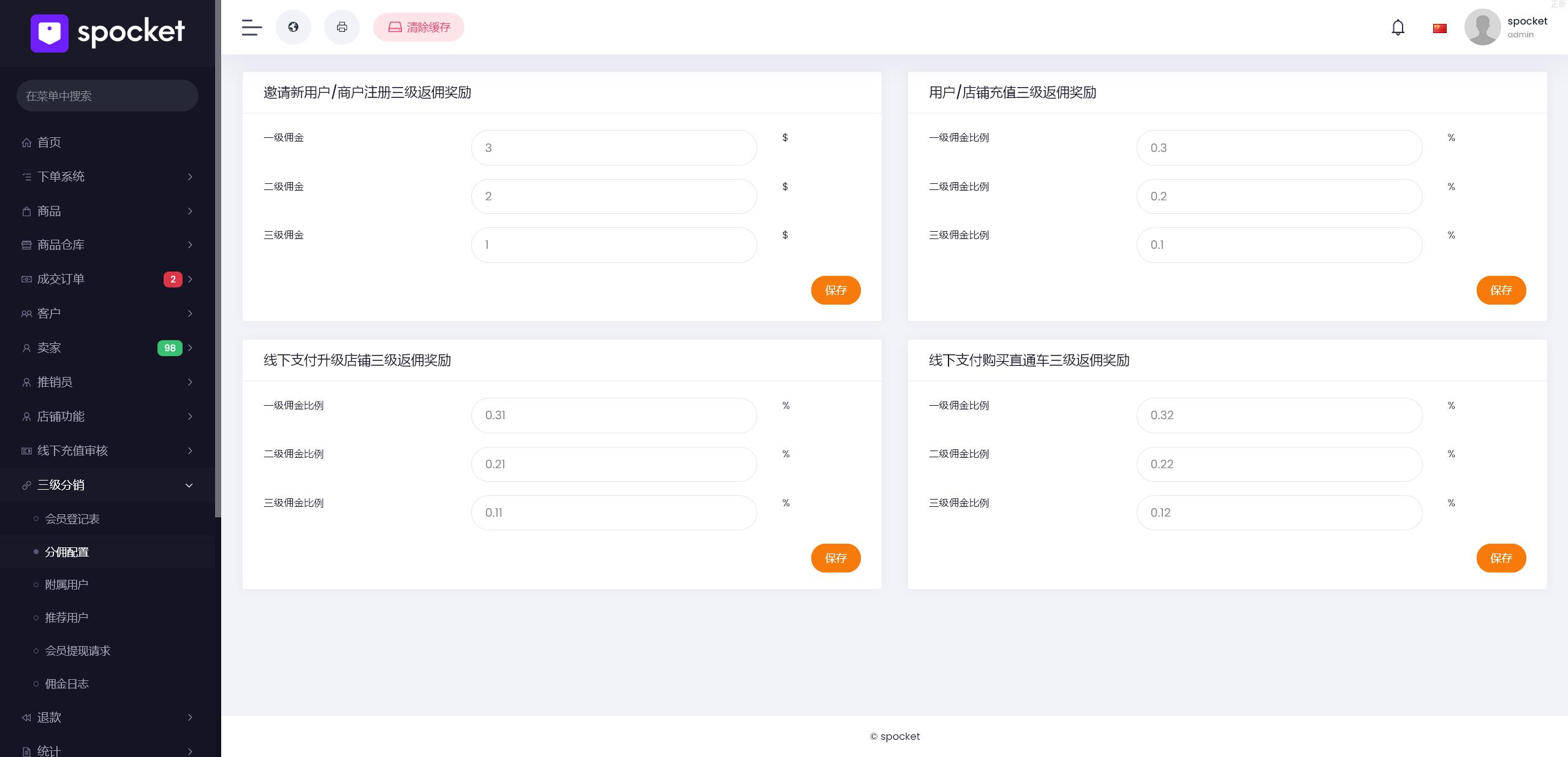 店铺佣金配置如一级佣金比例 二级佣金比例等 以此类推