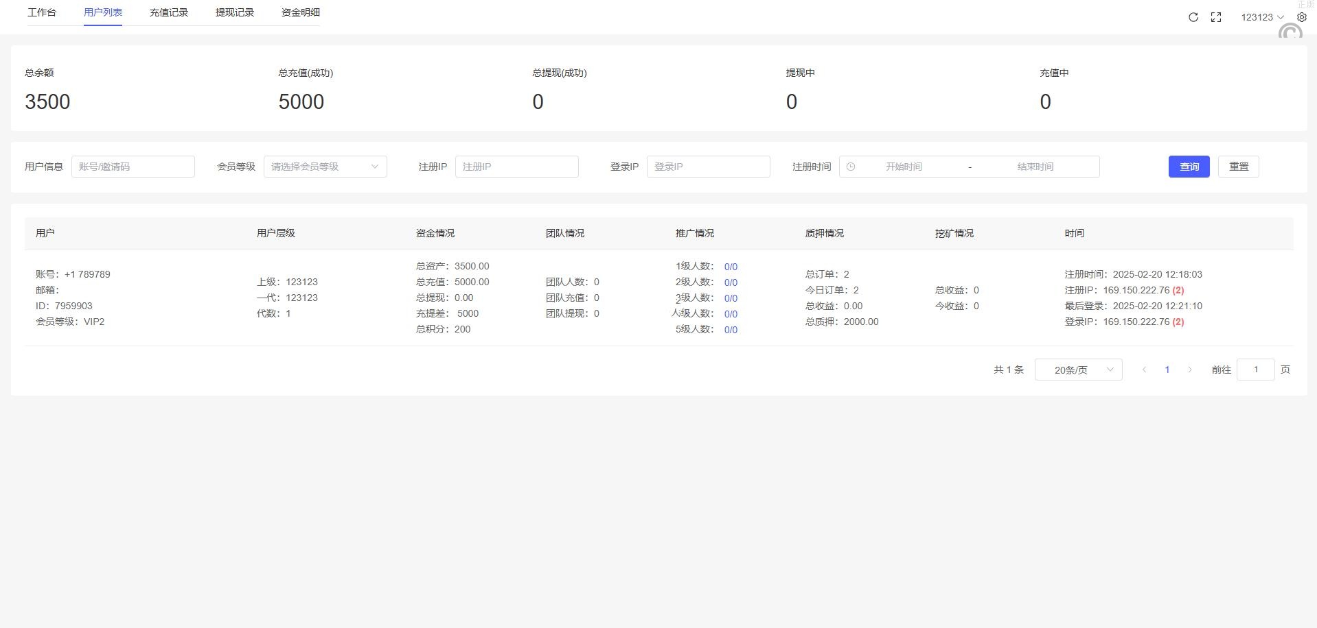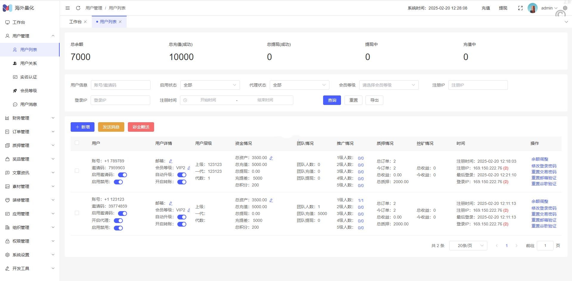 17、代理功能,后台开启用户为代理,即可登录代理端查看代理下级用户情况