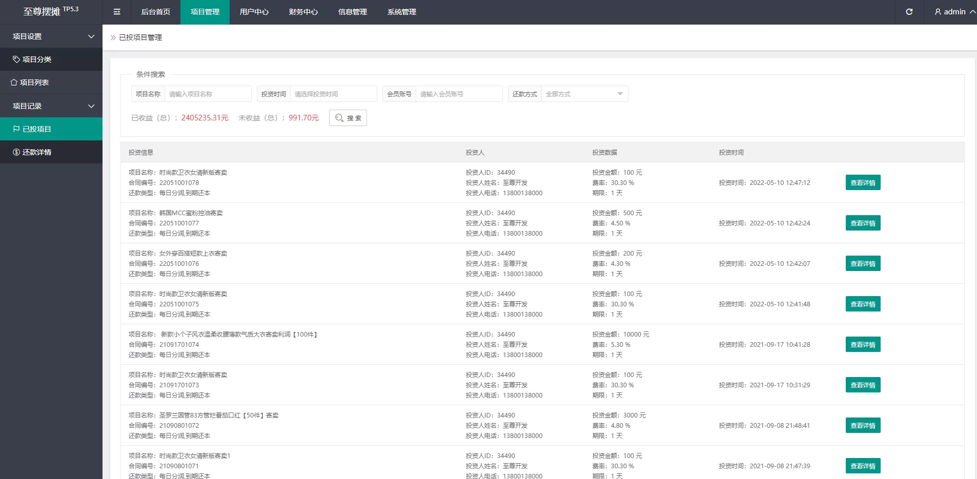 🛍 摆摊投资模式:支持用户投资摆摊项目,按比例获取投资分红