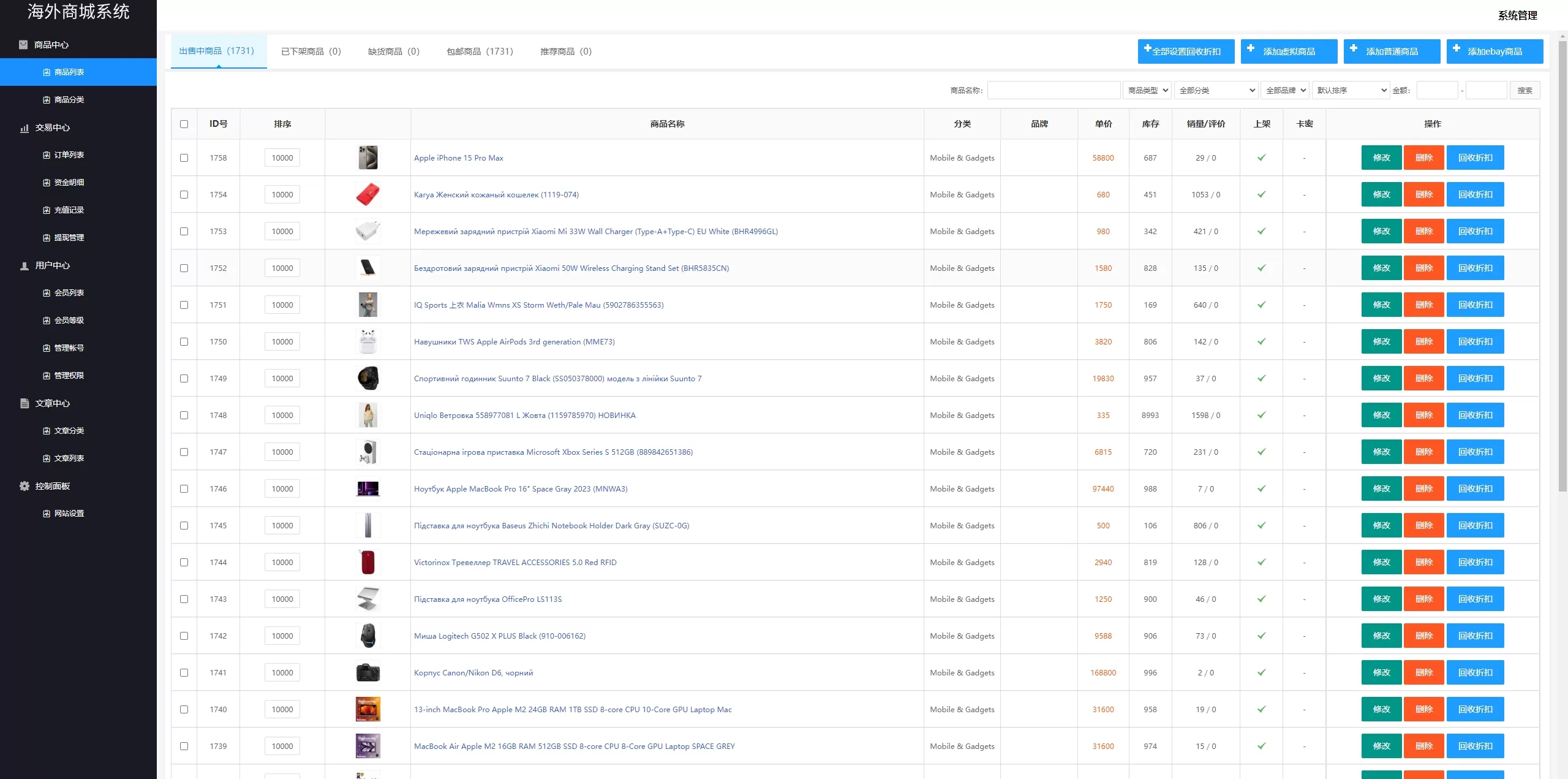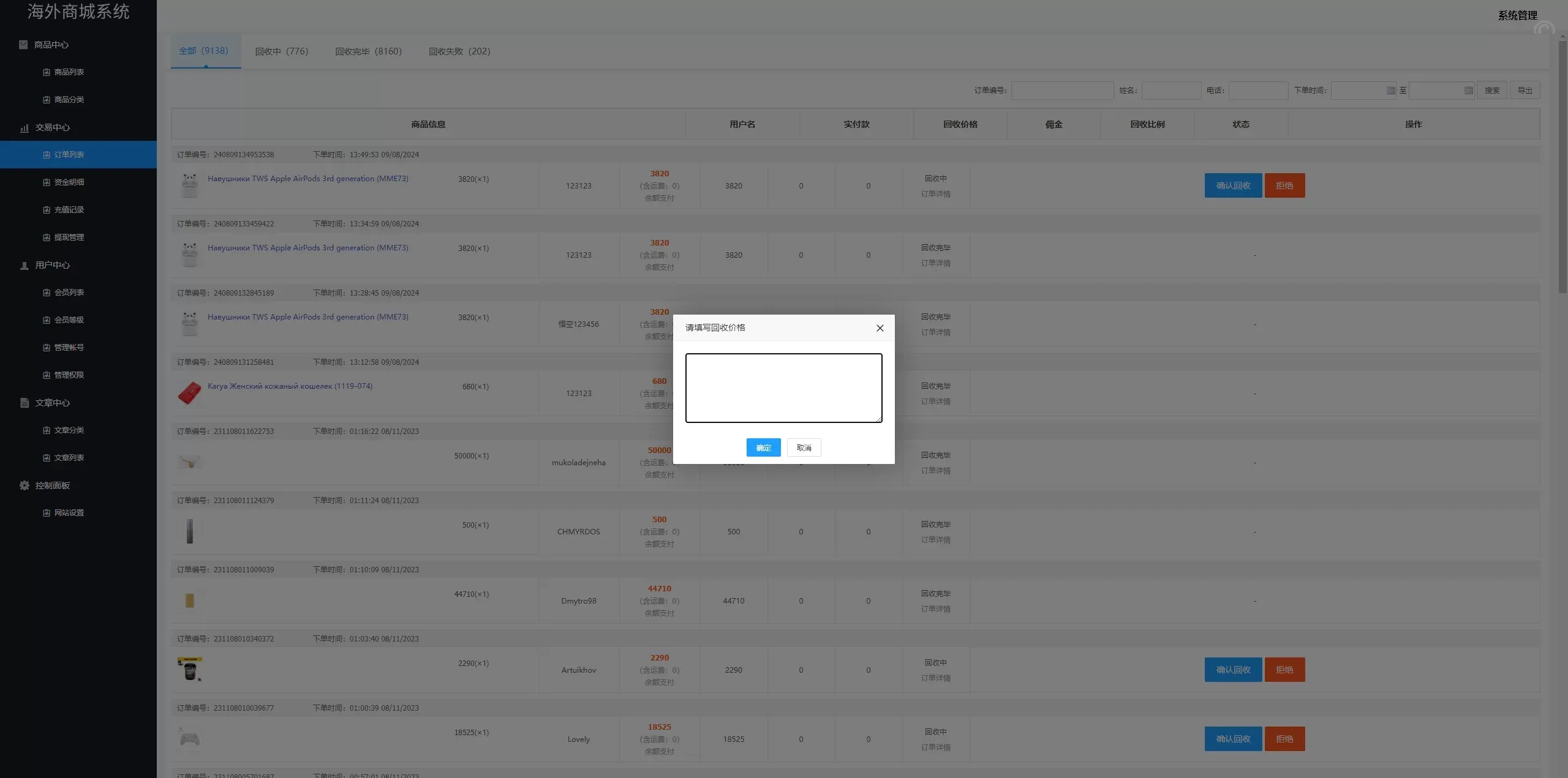 多國語言商城回收系统源码/订单自定义价格回收/特惠商城订单回收 主要功能亮点: 全新定制UI:前后端UI重新二开定制,提供更好的用户体验 多國語言支持:新增多國語言支持,包括中文、英文、越南语、波斯语、乌克兰语 订单回收功能:用户提交回收订单,后台可自定义输入回收价格 灵活的后台管理:支持订单价格自定义调整,方便管理操作 源码全开源:系统源码完全开放,便于二次开发和个性化定制 商城系统