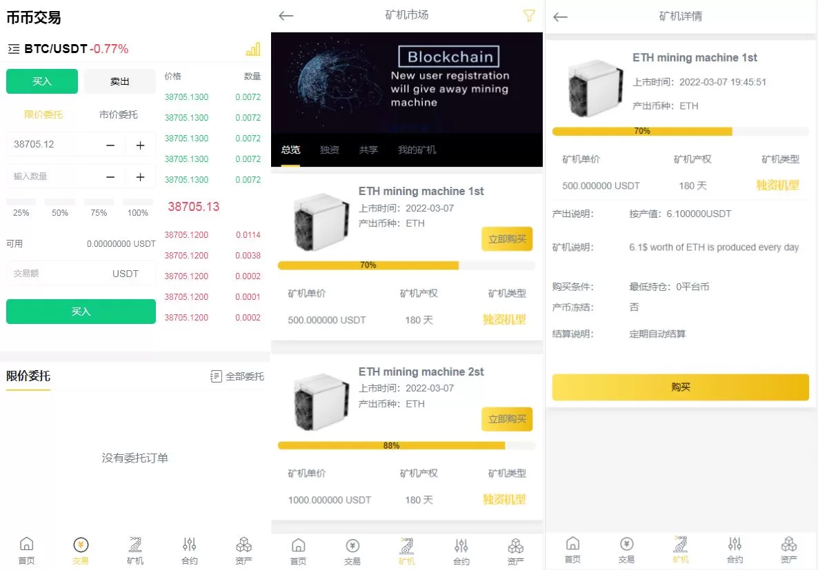 - 完整支持币币交易和区块链矿机系统,用户可以直接通过平台进行虚拟币交易和参与矿机挖矿。