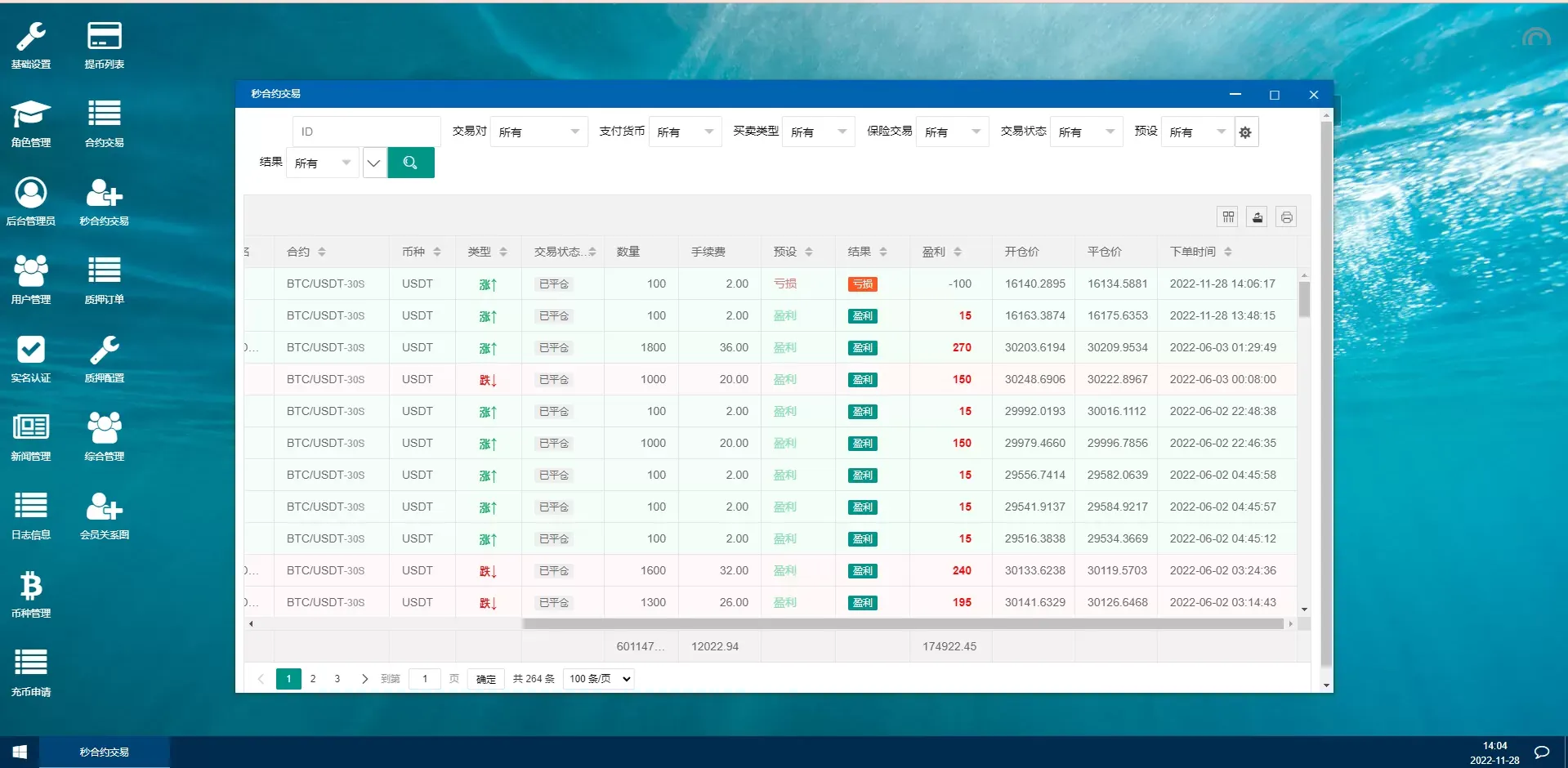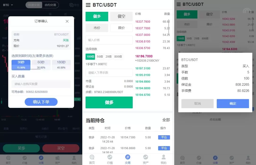 - 交易功能:秒合约交易系统,支持快速下单、平仓、结算等操作。
