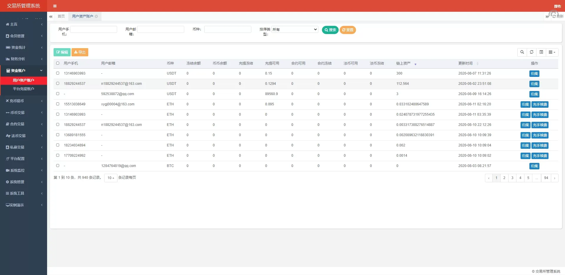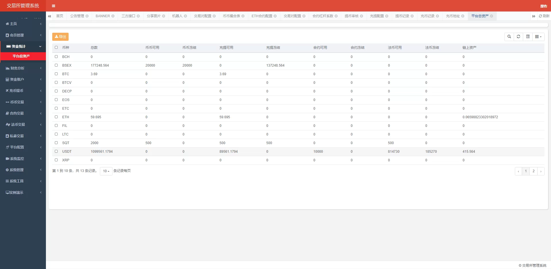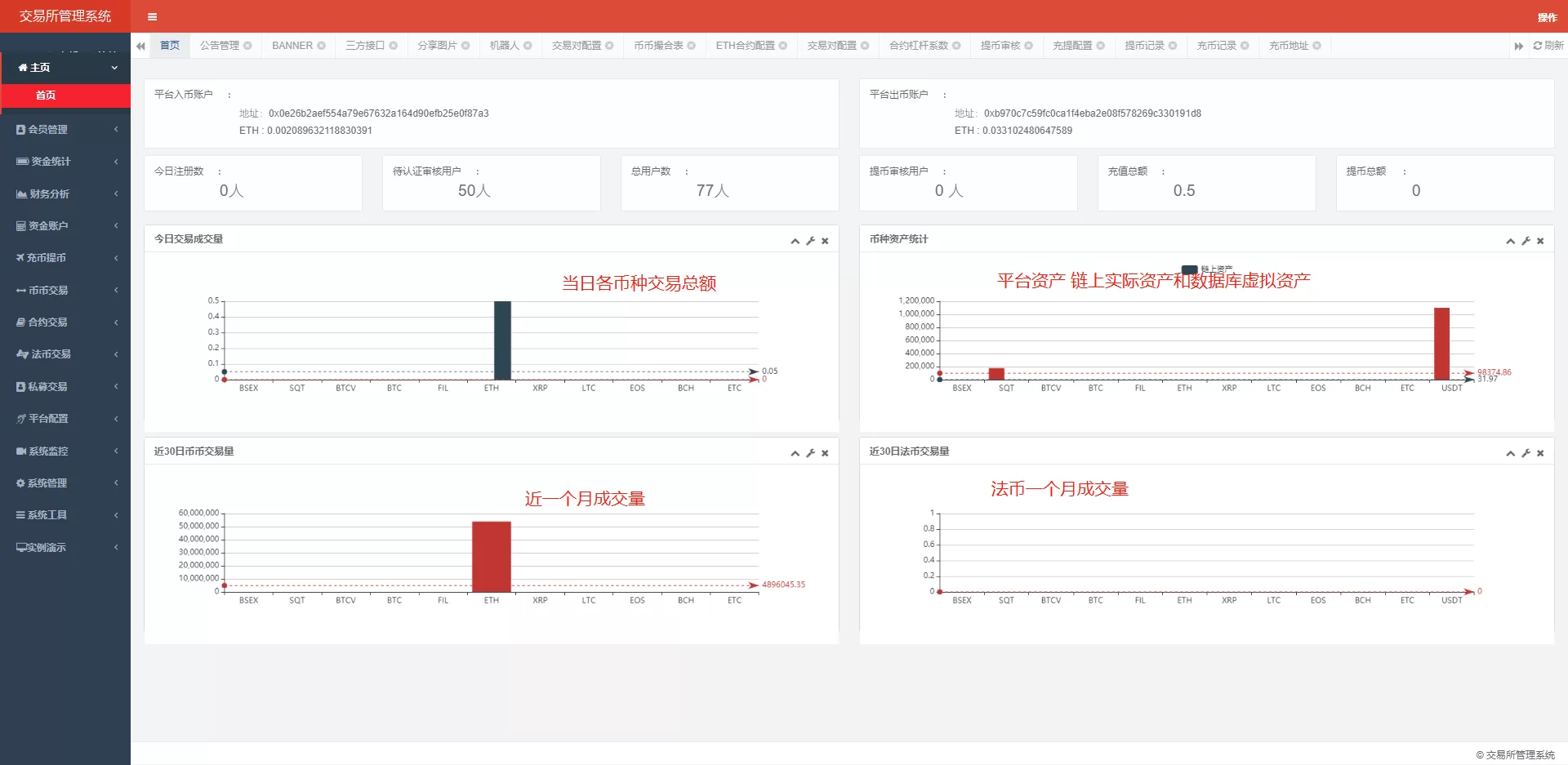 - 系统概况:实时查看币种统计、用户统计、交易统计等数据