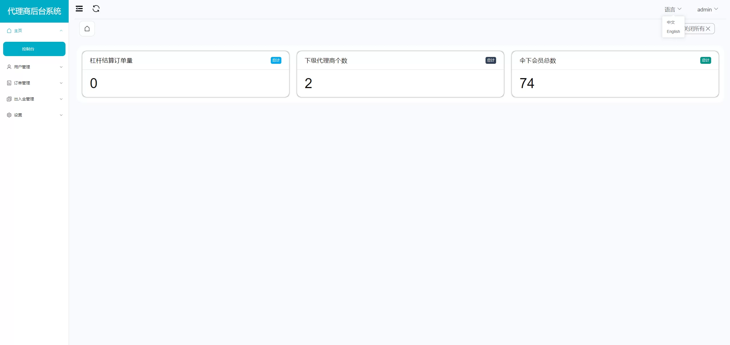 🔹 中英文切换:系统后台和代理后台支持 中英文切换,便于不同语言的用户使用。