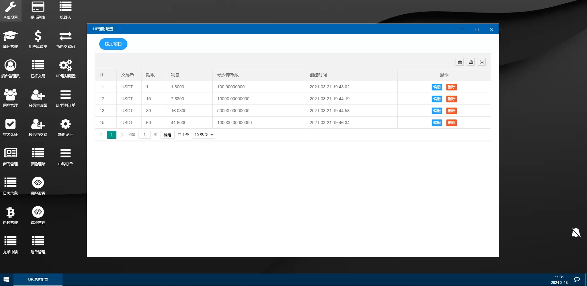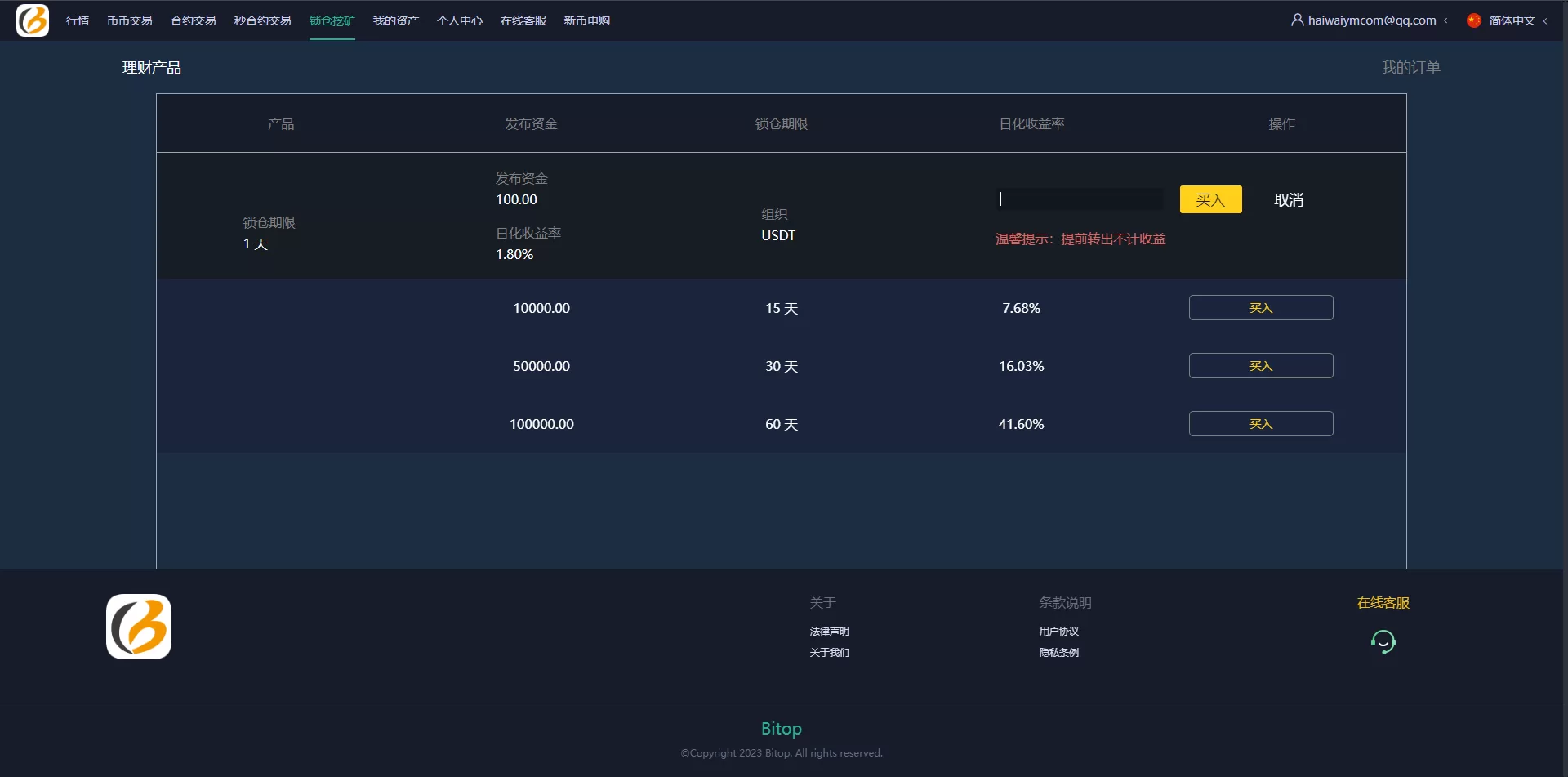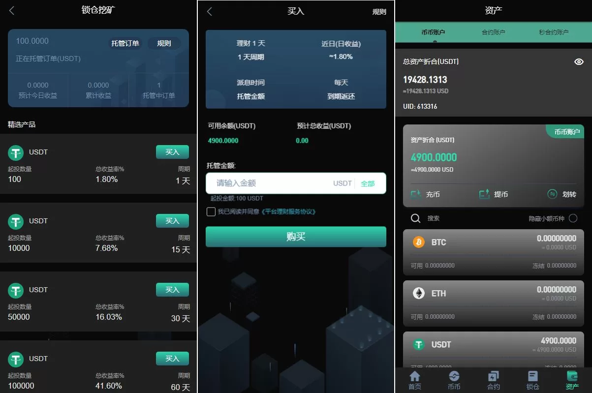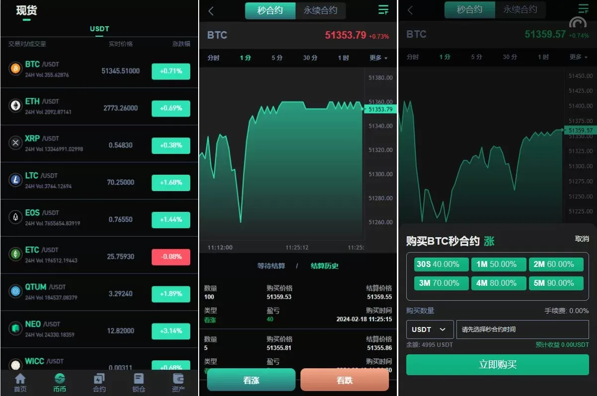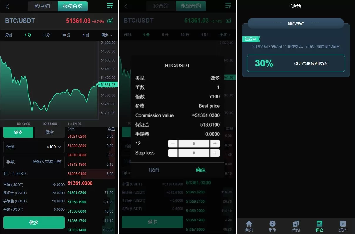 🔹 强大交易功能:系统支持多种交易功能,包括 秒合约、永续合约,满足不同投资者的需求,同时提供 锁仓挖矿 和 新币认购 功能,丰富投资方式。