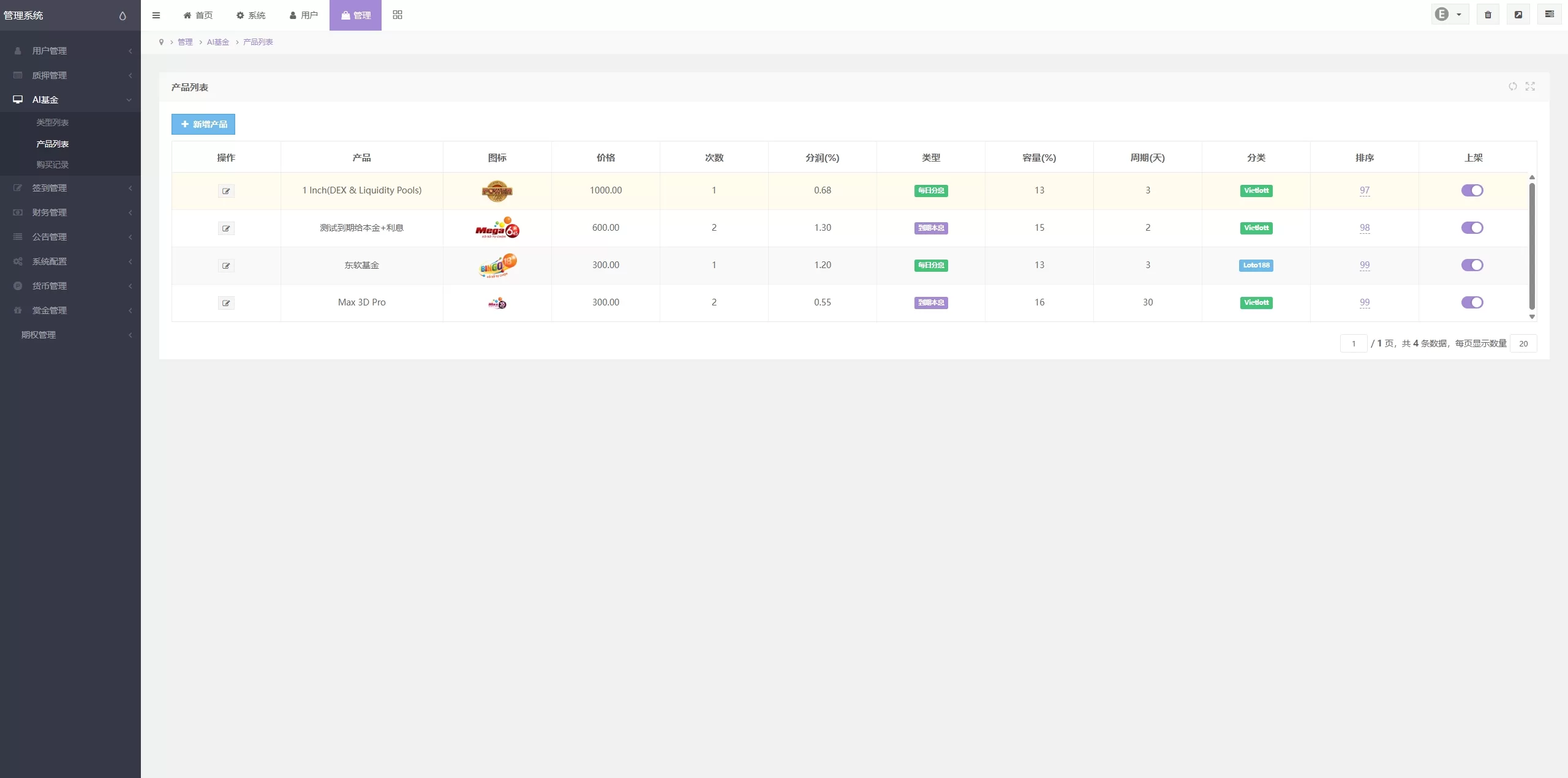 提供多种AI基金项目选择(如Yieldott、Xoso、Loto188等)。