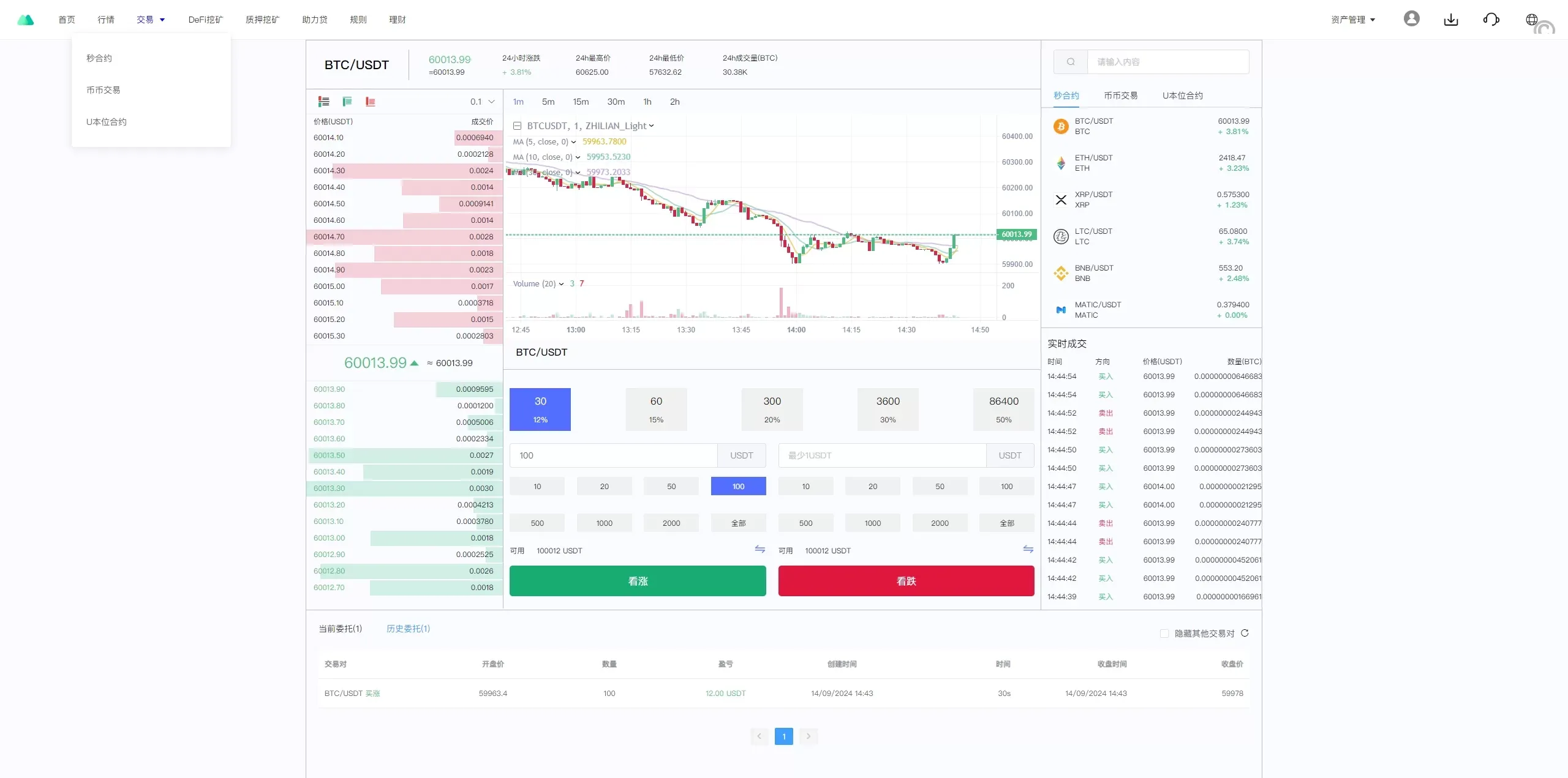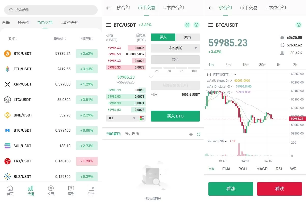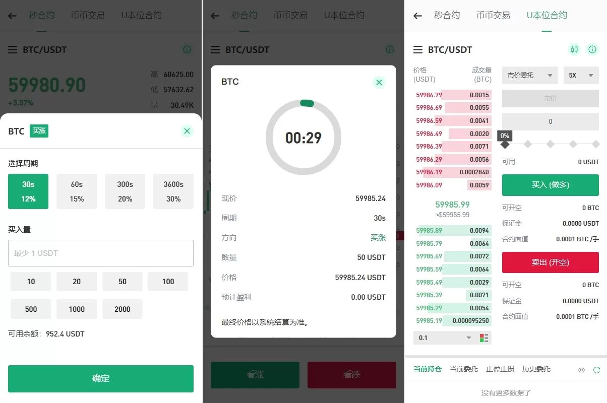 - 秒合约:极速合约交易,适合短期市场波动操作。