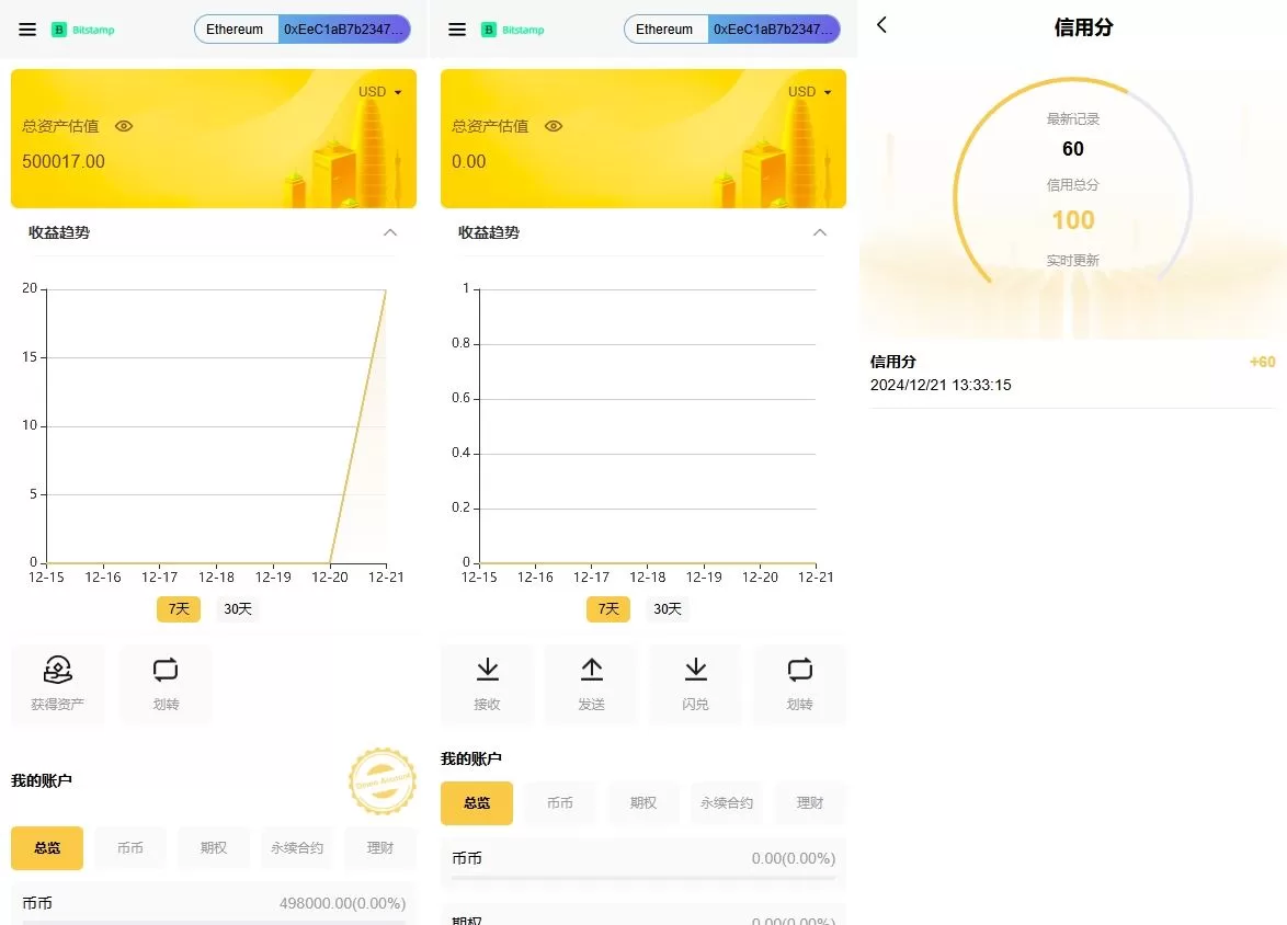 - 前端账户支持 真实账户 和 模拟账户,模拟账户每月可领取虚拟资产,方便用户体验平台功能。