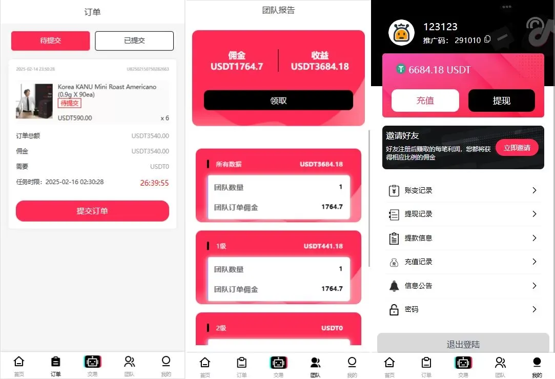 多國語言TikTok抢单刷單系统源码/特惠TikTok刷單/分组/打针/前端Vue 主要功能亮点: 多國語言支持,适配多國語言环境,满足特惠用户需求 前端Vue开发,高效响应式设计,用户体验流畅 后端PHP(ThinkPHP框架),高效稳定 系统功能:支持分组、打针、做单等操作 权限代理,独立代理后台管理 抢单刷单源码 精品源码 项目投资理财