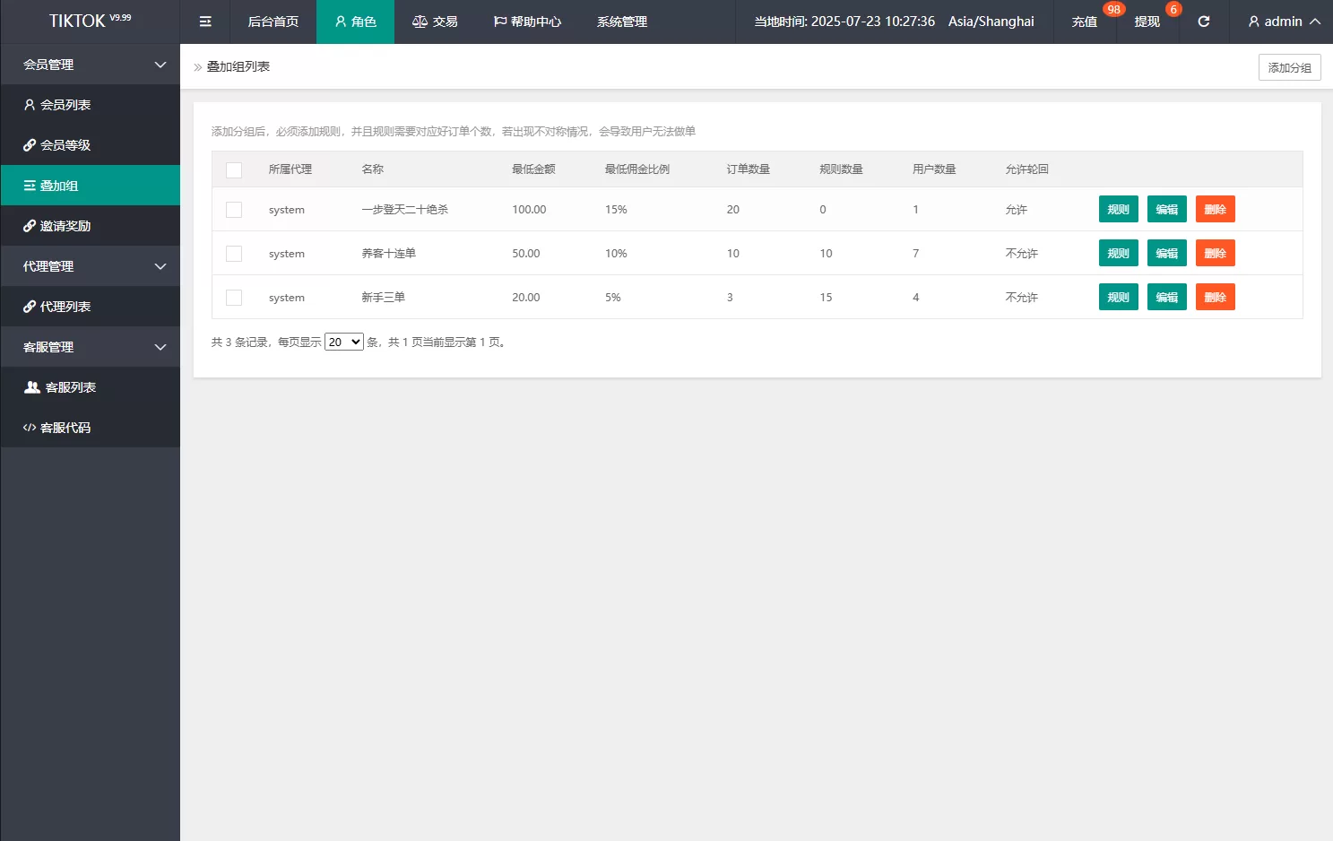 系统功能:信用分、打针、做单、叠加组、利息宝等功能
