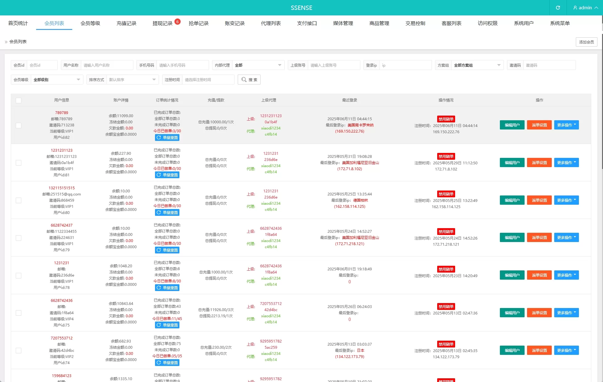 系统功能:派单(支持幸运单,高级单),連單卡單,信用分,订单重置等功能