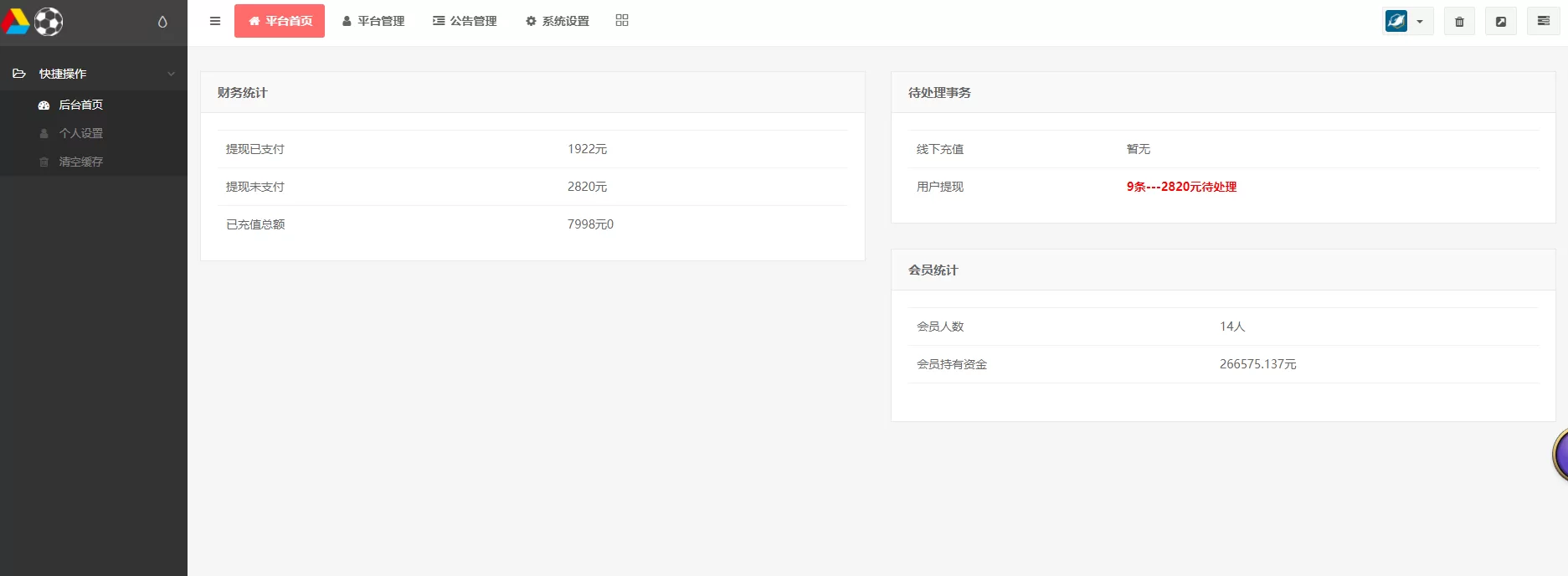 - 12.后台增加平台数据统计,会员量,充值量,提现量,会员持有资金统计等,,