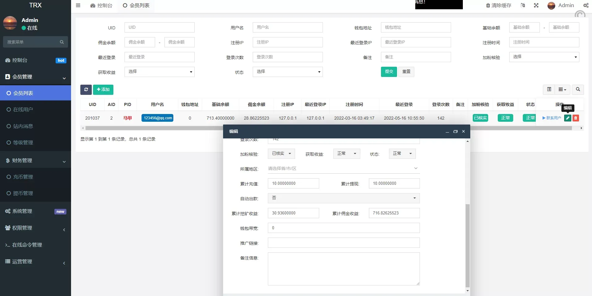 6.会员列表,平台所有用户的信息,支持各种查询,点击pid可以查看每个用户的团队成员、基本信息、资金流水充值记录和提币记录、也可以是否运行会员提现、禁用或者锁定账号的功能。