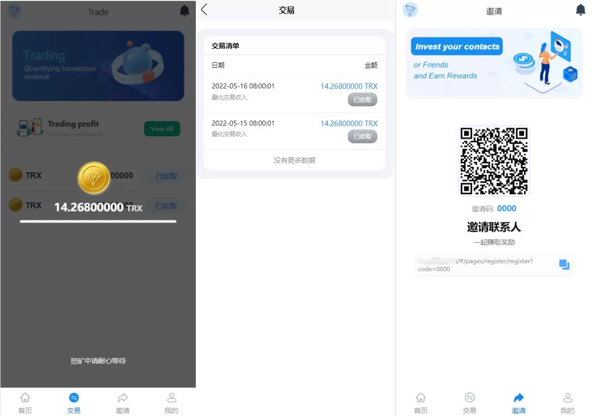 1. 邀请。用户可以通过二维码或者邀请链接推广注册,通过这个邀请链接注册的用户,都会在你的下级,客户通过你的邀请链接注册后你可以得到佣金(后台可设置),之后下级用户充值或者获取收益你都会有返佣 (该收益是到钱包账户) 用户不可提现