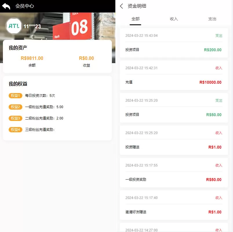 💼 投资理财与认购系统:系统支持投资理财及认购功能,用户可参与不同理财计划。