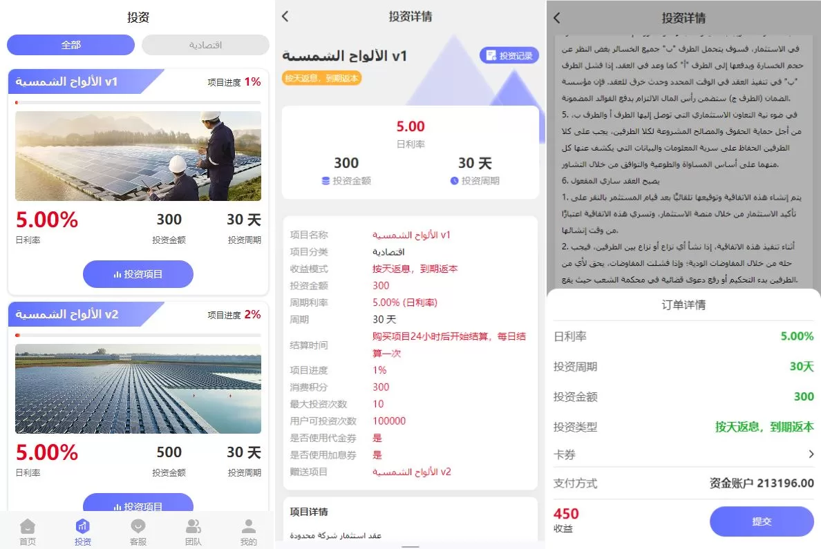 阿拉伯投资理财系统源码/特惠投资众筹系统/前端vue开发 主要功能亮点: 🌍 前端使用vue开发:带源码,确保高效、流畅的用户体验。🔧 后端使用thinkphp框架:稳定且灵活,便于定制与扩展。💼 多國語言支持:系统前端支持多种语言,能够覆盖不同市场。📊 产品管理后台:系统产品类型和内容完全可修改,适应不同投资项目需求。💡 功能完善:涵盖了投资、理财、众筹等多功能,操作简便,易于管理。 🔓 源码全开源,可以根据需求灵活调整,助力快速实现全球化布局! 项目投资理财