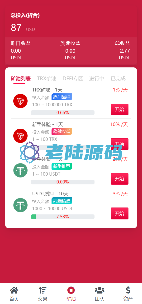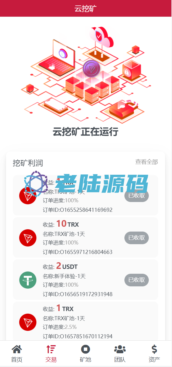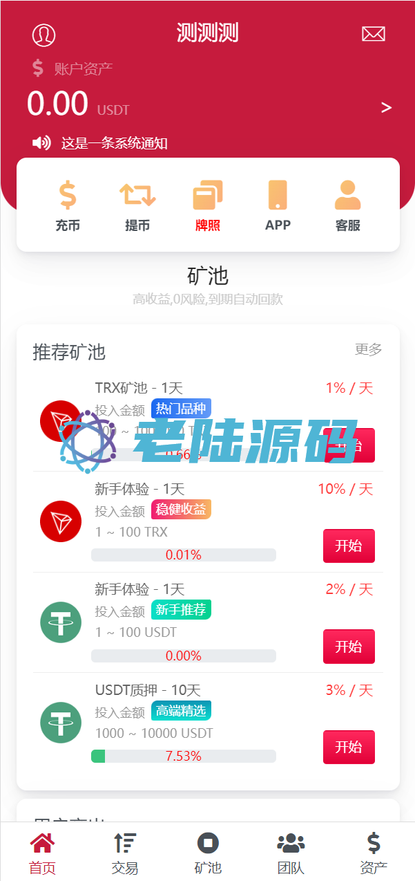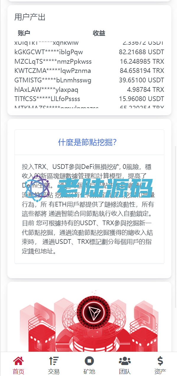 【特惠区块链投资理财】亲测USDT/TRX区块链理财系统/质押挖矿/云算力矿机系统 亲测USDT/TRX区块链理财系统/质押挖矿/云算力矿机系统 源码是全新开发的usdt/trx双币种的矿机投资系统 支持双币种充值提币方式,源码前端是编译后的,介意勿扰 USDT/TRX区块链理财 云算力矿机 区块链 区块链理财 投资理财 质押挖矿