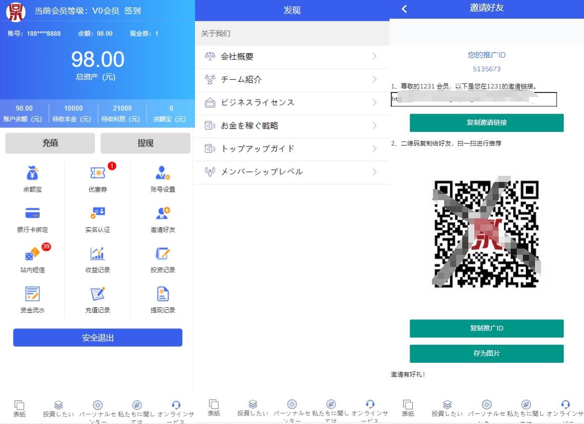 新UI影视投资/日语投资系统/优惠加息送卷/虚拟币充值/在线客服 全新UI影视投资/日语投资系统/优惠加息送卷/虚拟币充值/在线客服 全新UI开发,语言只有一个日语的 新功能:在线客服、在线会员、优惠加息、券券赠送、虚拟币充值等功能 注:在使用本系统时,使用方必须在国家相关法律法规范围内并经过国家相关部门的授权许可,禁止用于一切非法行为。使用用途仅限于测试、实验、研究为目的,禁止用于一切商业运营,本站不承担使用者在使用过程中的任何违法行为负责。