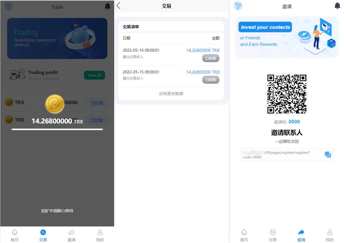 1. 邀请。用户可以通过二维码或者邀请链接推广注册,通过这个邀请链接注册的用户,都会在你的下级,客户通过你的邀请链接注册后你可以得到佣金(后台可设置),之后下级用户充值或者获取收益你都会有返佣 (该收益是到钱包账户) 用户不可提现