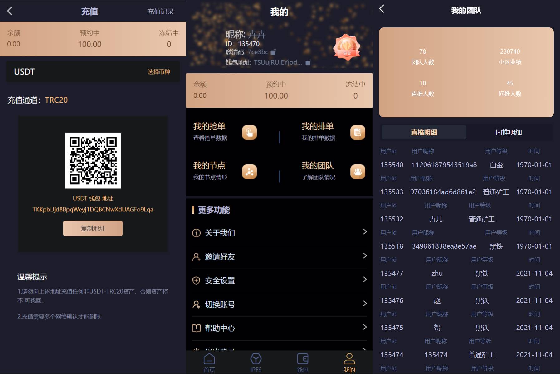 IPFS算力矿机挖矿源码/usdt排单众筹系统/usdt理财分红系统 IPFS算力矿机/usdt排单众筹系统/usdt理财分红系统 系统附带IPFS算力矿机系统 前端排单跟抢单系统不知道咋玩的,前端编译后版本