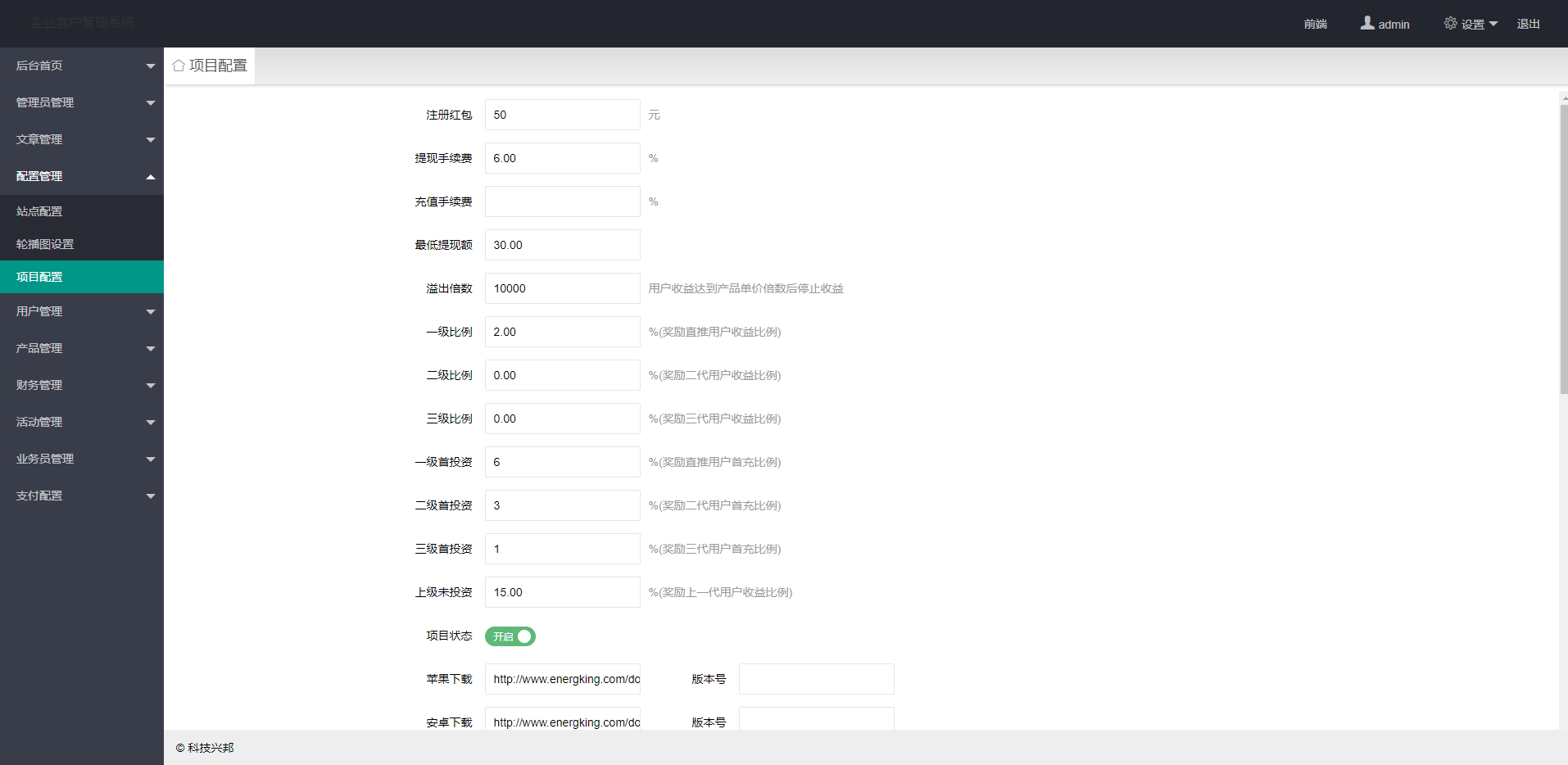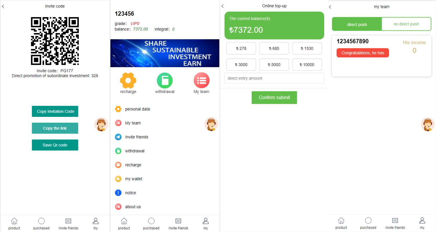海外版理财分红系统/共享投资源码/充值赠送/注册红包/三级代理 一款不一样得海外投资源码,前端源码是双语言,但是源码里带的是多个语言包,没有翻译完整 系统功能基本符合运营需求,三级代理、充值活动、收益活动等功能 支付对接第三方,需要自己更改