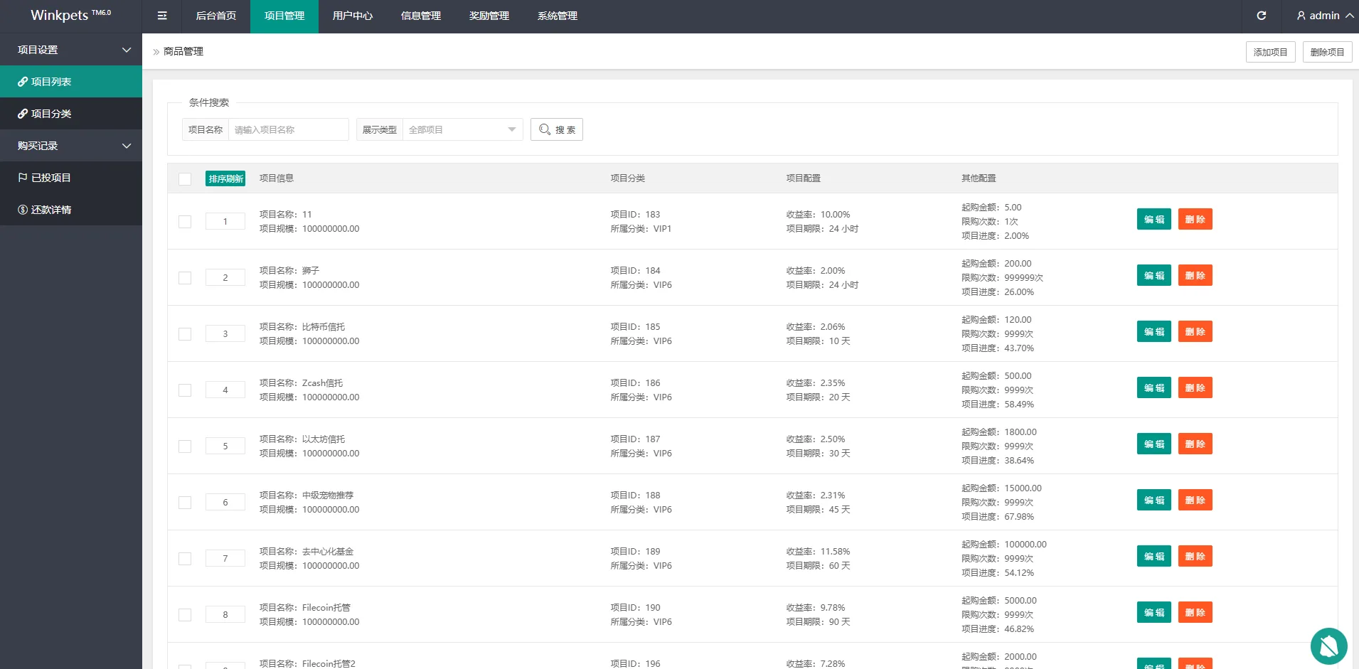 系统功能支持单独项目投资,会员等级对应级别宠物领养投资