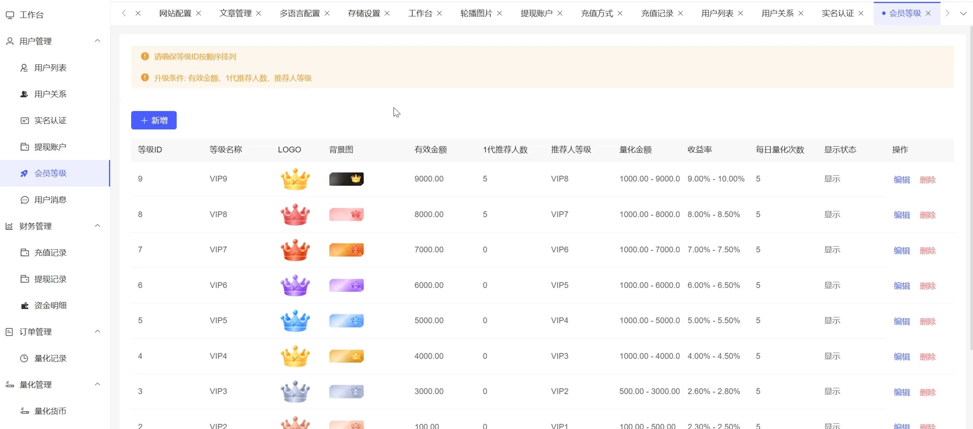 3、VIP等级划分,升级条件: 用户有效金额、1代推荐人数、推荐人等级