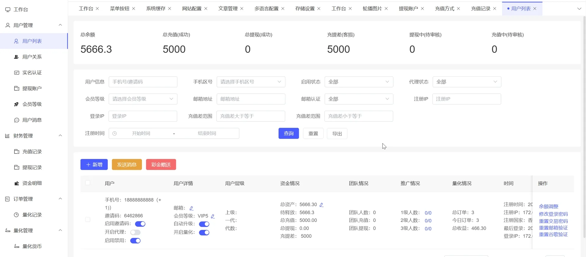 19、代理线功能,后端开启用户为代理,即可登录代理端查看代理下级用户情况