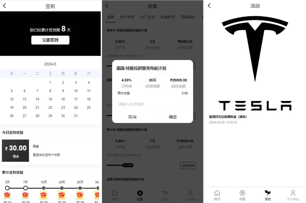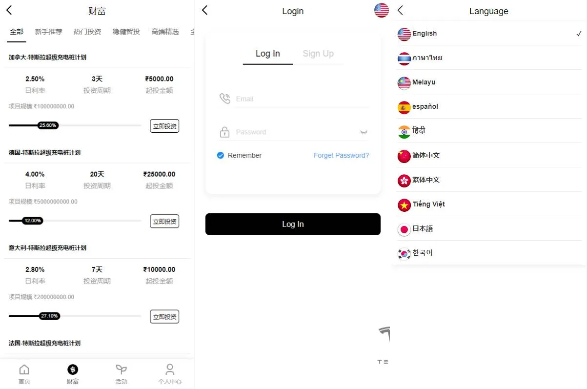 海外多语言理财投资特斯拉充电桩vue定制UI项目投资系统源码