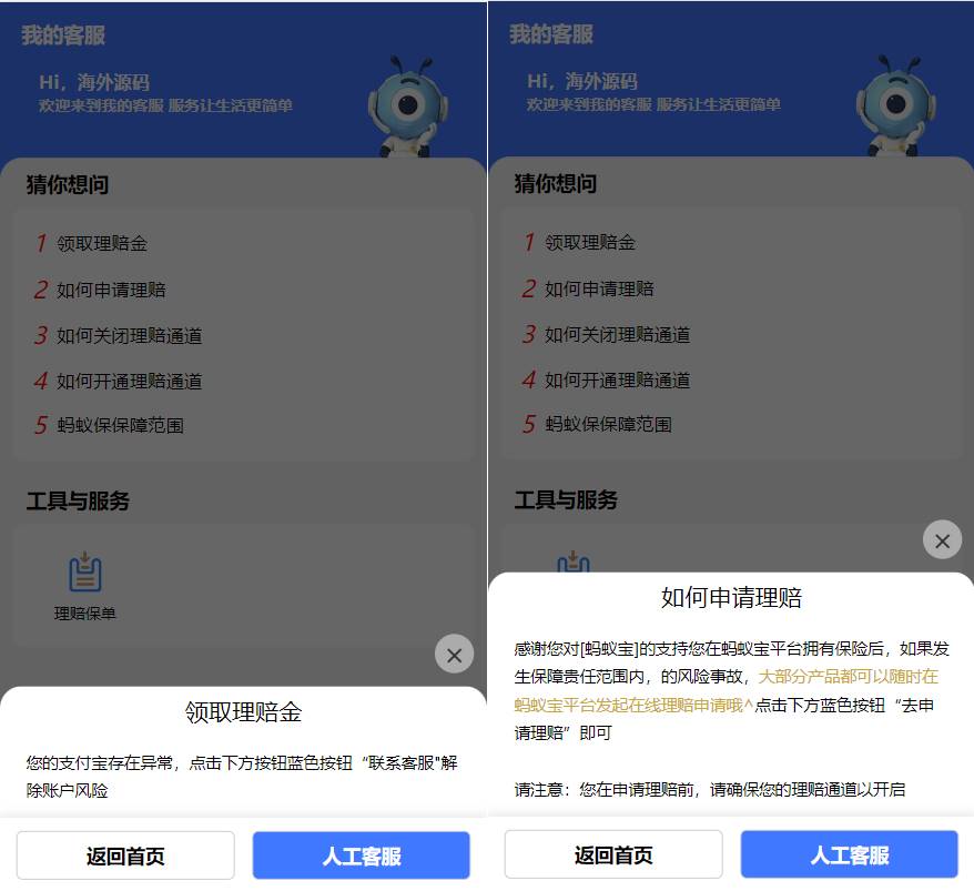 一款支付宝理赔系统,每个用户可单独设置客服跟理赔选项内容