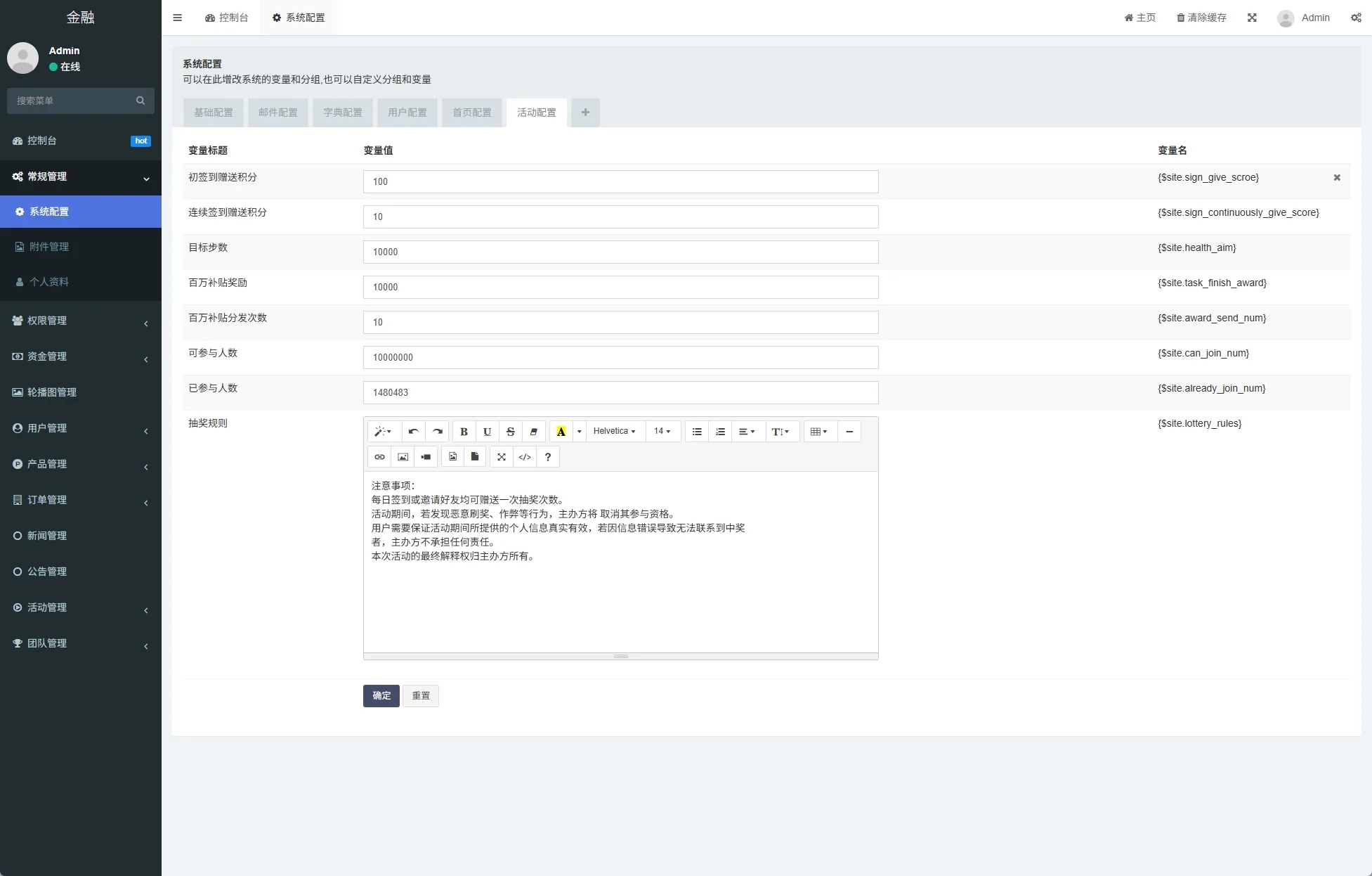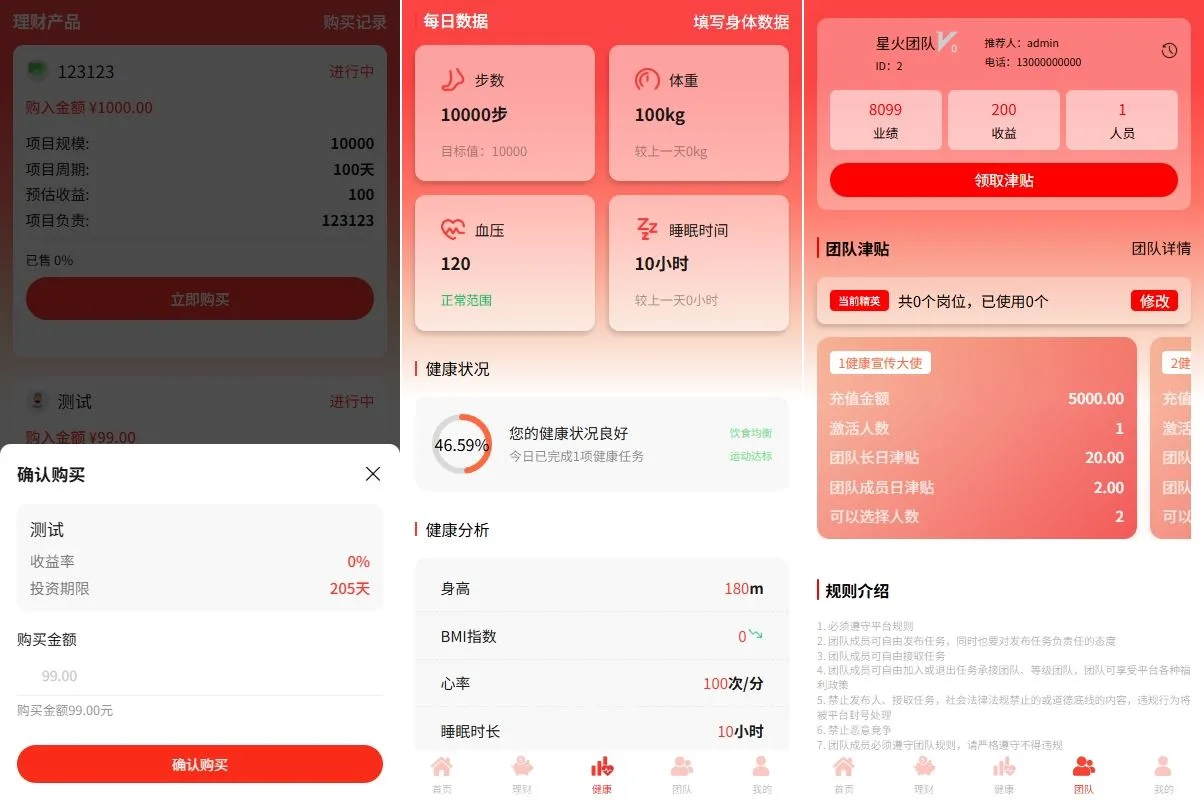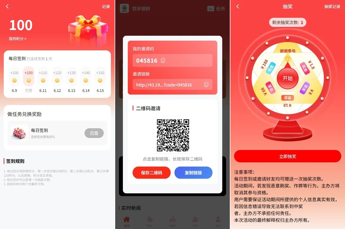 系统功能:签到、抽奖、爱心公益、借贷、健康数据、积分商城、活动任务等功能