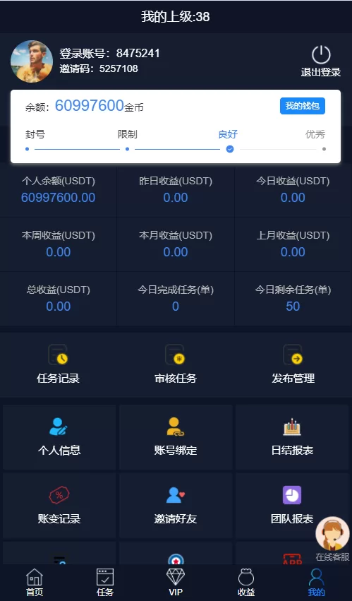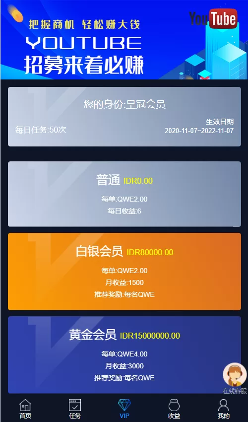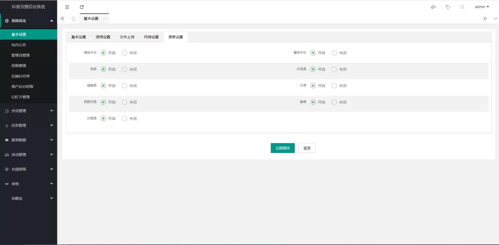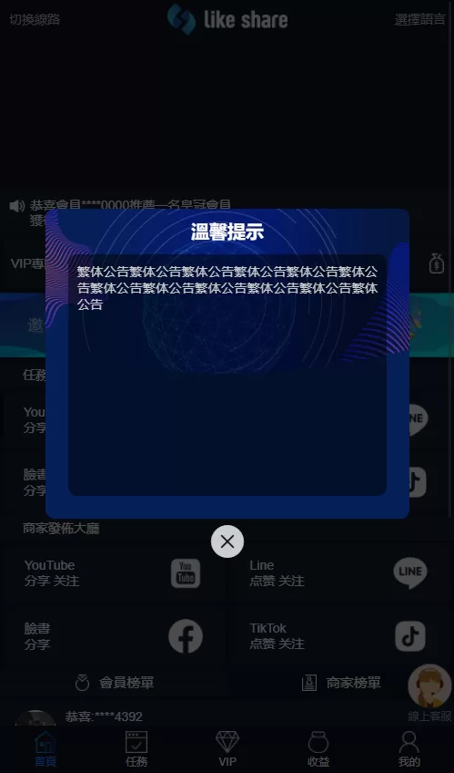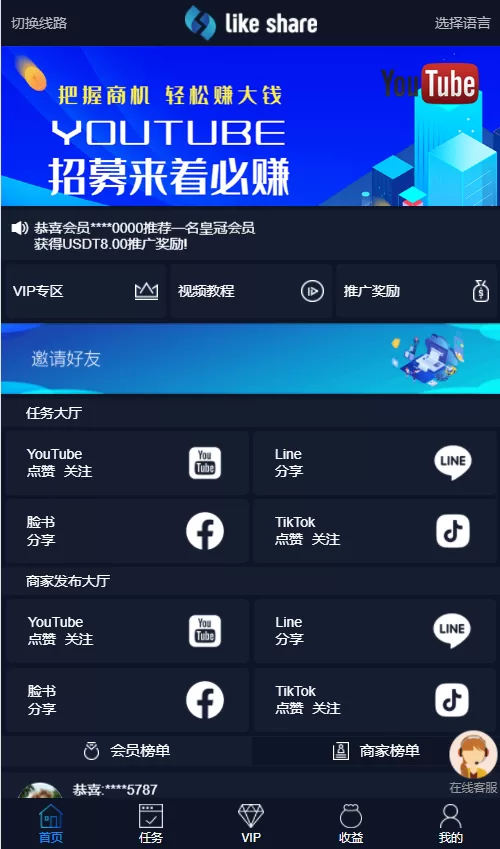 理财投资[海外点赞]国际版多语言点赞抖音分享点赞任务平台源码(九种语言)/附带VUE精品下载 九种语言 :西班牙语,泰语、日语,印度尼西亚语言、越南语言、英文、繁体中文,简体中文,印度语 前台支持更换5种颜色风格,黑,银,橙,紫,绿。非常大气和美观的一套系统 前台:首页可领取脸书tiktok等点赞关注任务!任务等级分为七种,每种等级领取的任务数量各不同。三级分销,没级代理各不同。可查看个人信誉度。 后台:可自定义设置自己的网站域名,客服qq,app名字等等、余额宝理财,财务明细等等! 亲测源码