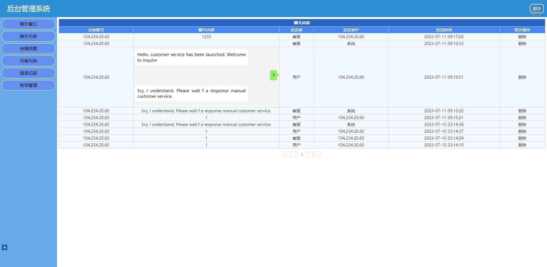 6,后台可设置是否关闭机器人,如关闭,正常会话模式,如打开,自动回复模式,自动回复内容要自己在代码中增加或修改