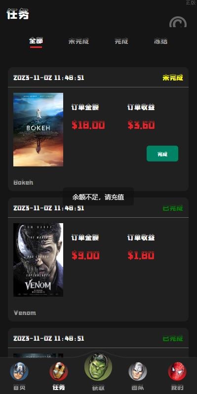 【特惠多國語言的电影票房刷單】特惠漫威电影抢单刷單系统/策略刷單/订单自动匹配 特惠多國語言漫威电影刷單系统,系统带单独代理后台 可添加用户策略,注册送礼等功能 前端uinapp开发带源码,后端thinkphp框架 海外漫威电影抢单刷单系统 独家推荐 电影刷单