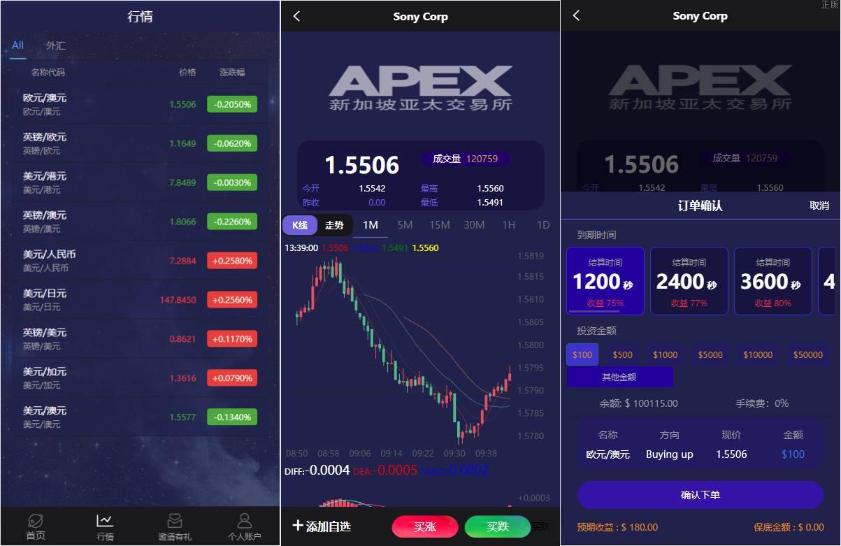 特惠APEX新UI多國語言微盘外汇系统/时间盘微盘源码