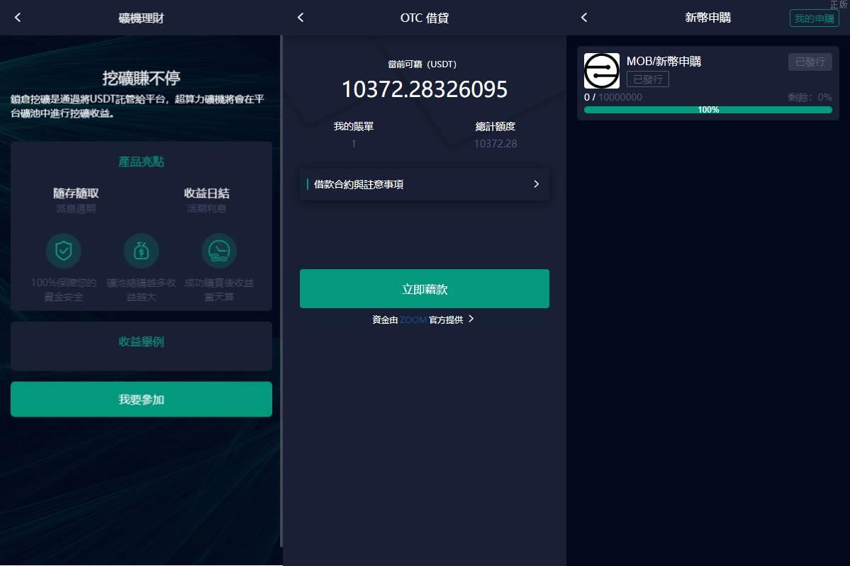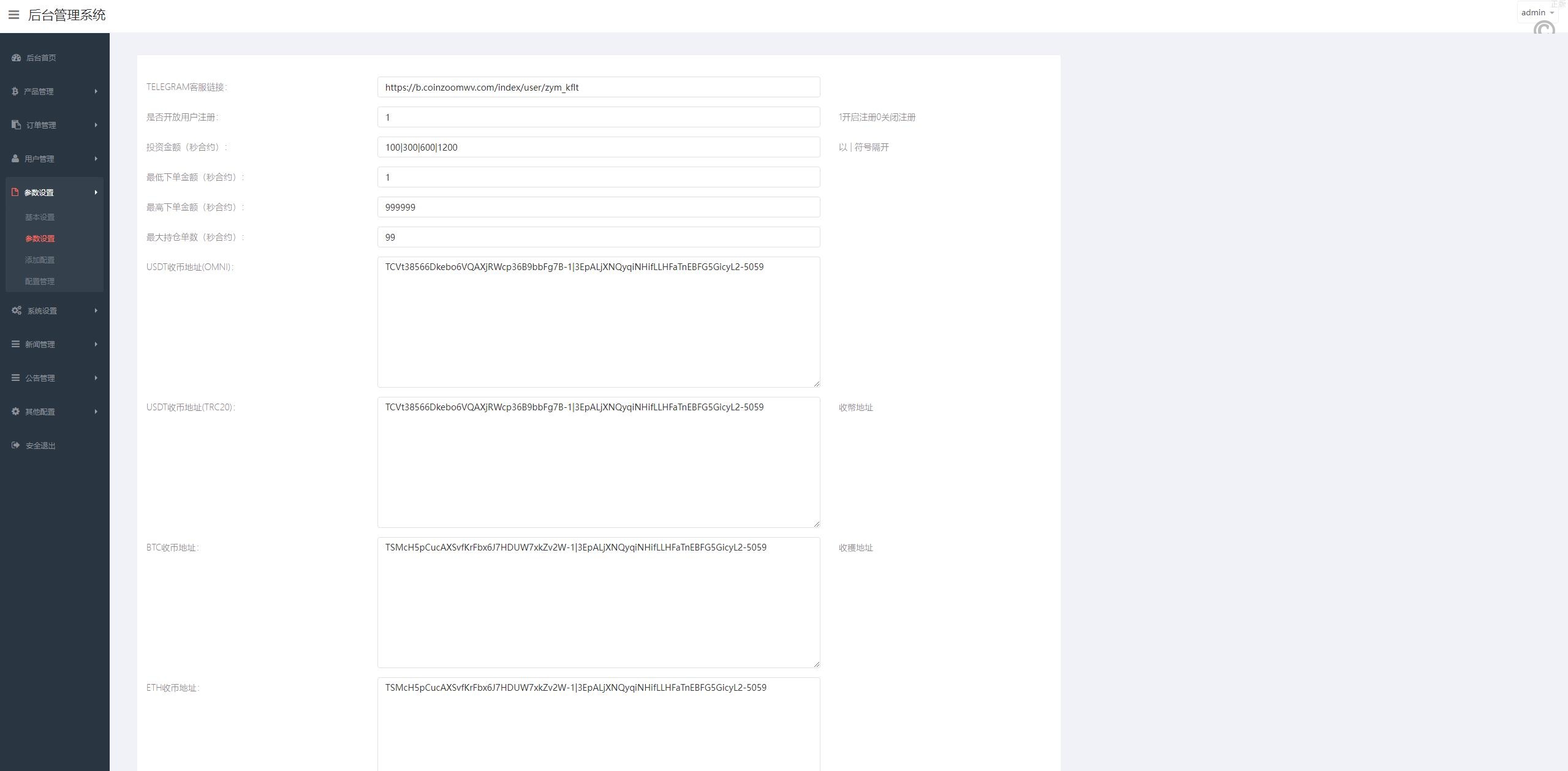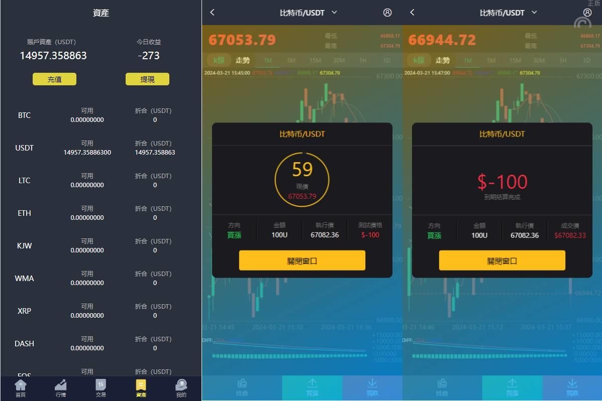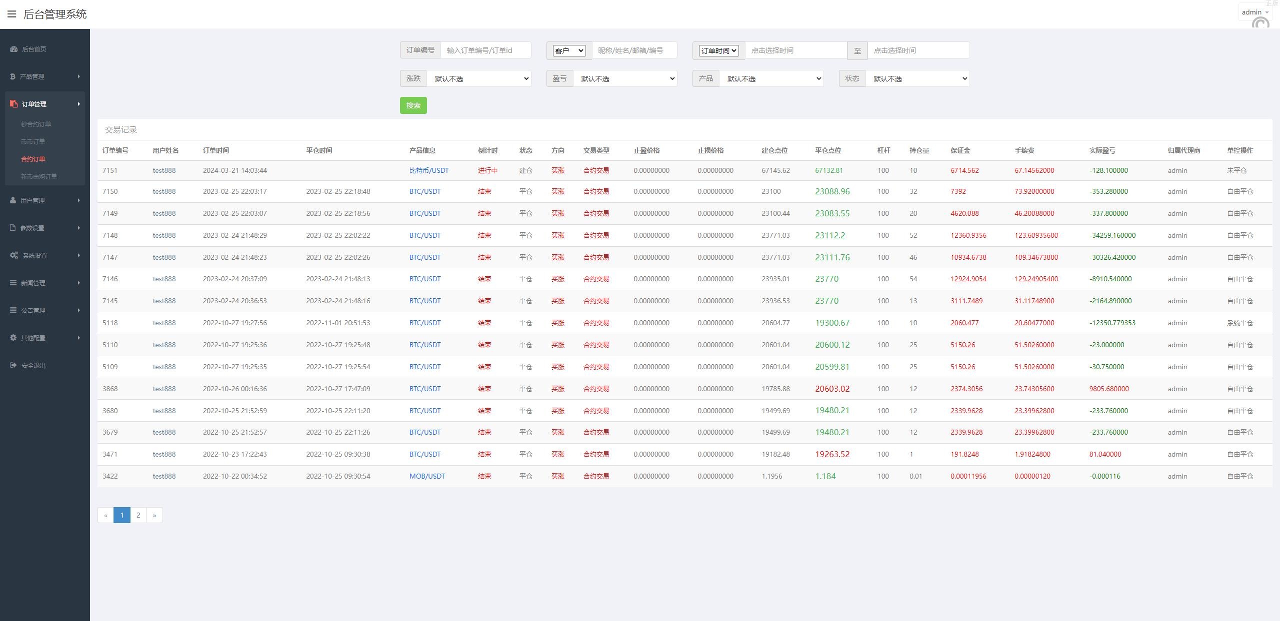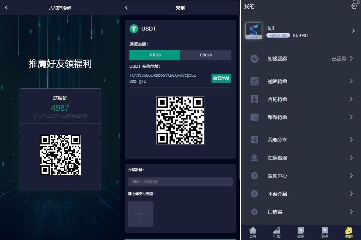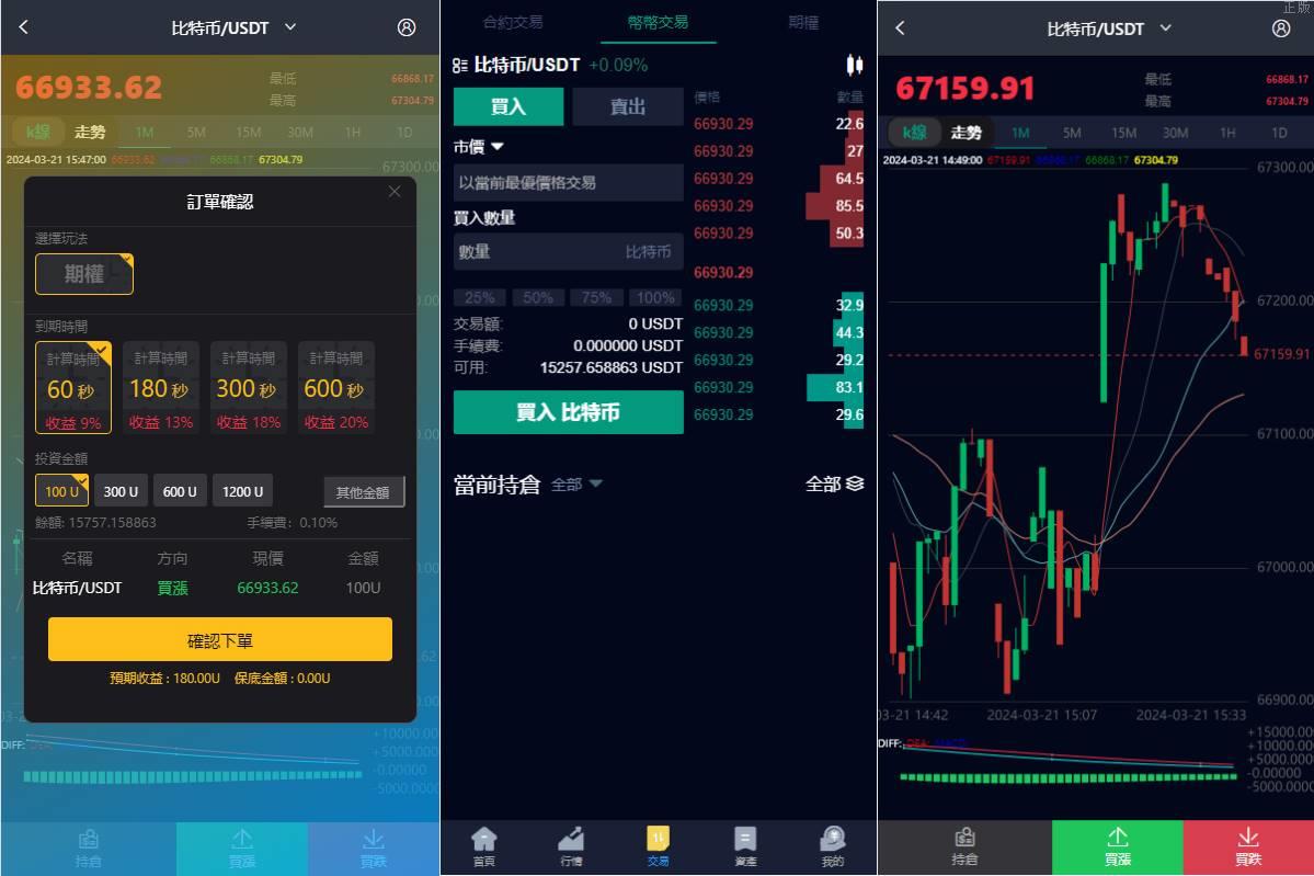 系统支持币币交易、合约交易、期权交易、投资理财、在线客服、新币申购等功能