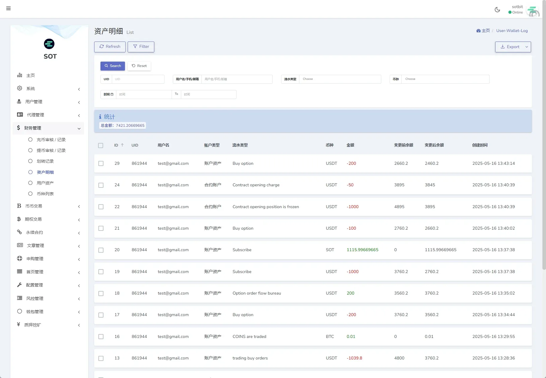 3、钱包管理(用户钱包管理、资金调节、钱包日志、转入转出记录)