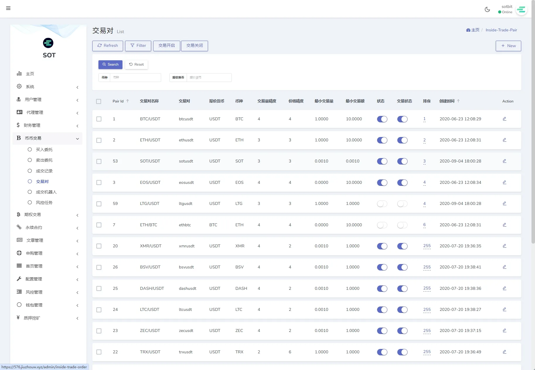 4、币种管理(币种的添加设置、提币账户管理、是否显示、交易对管理)