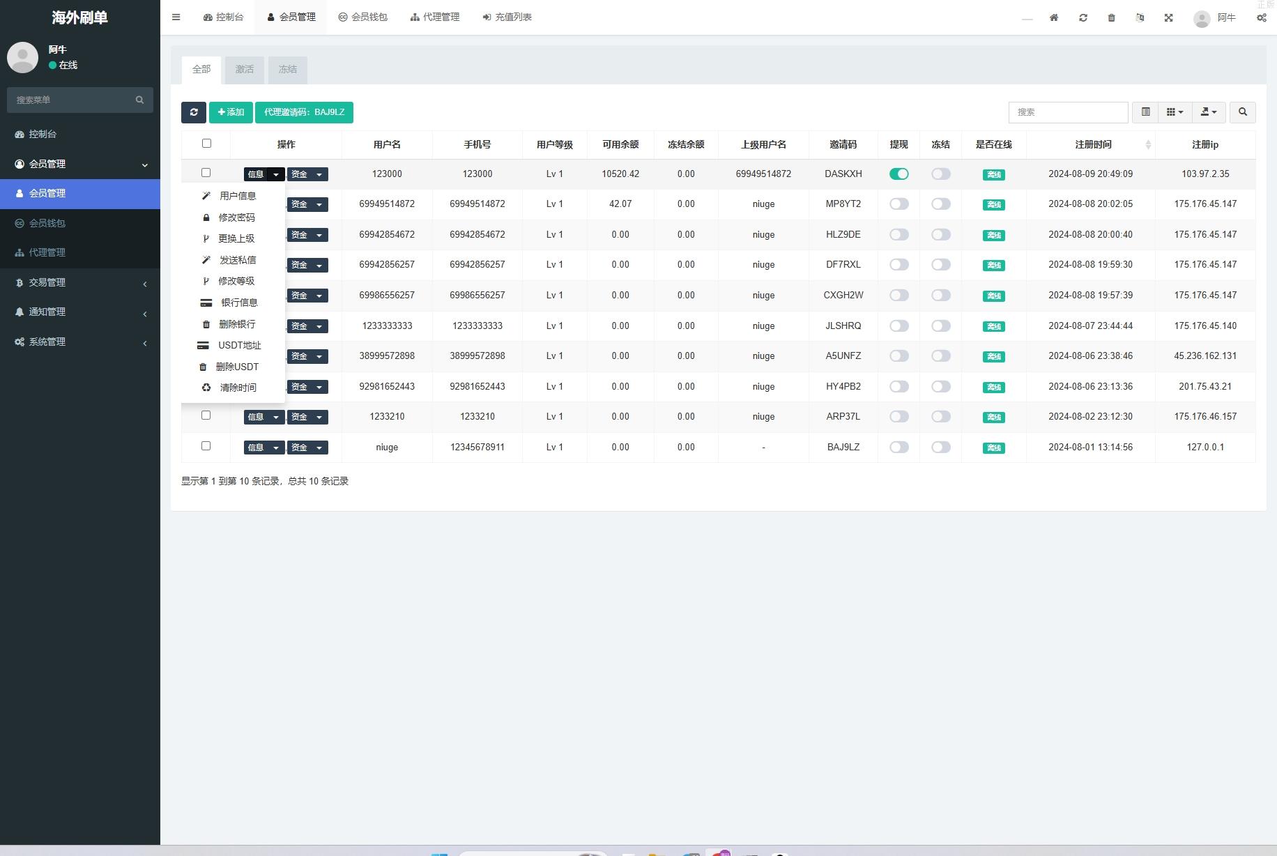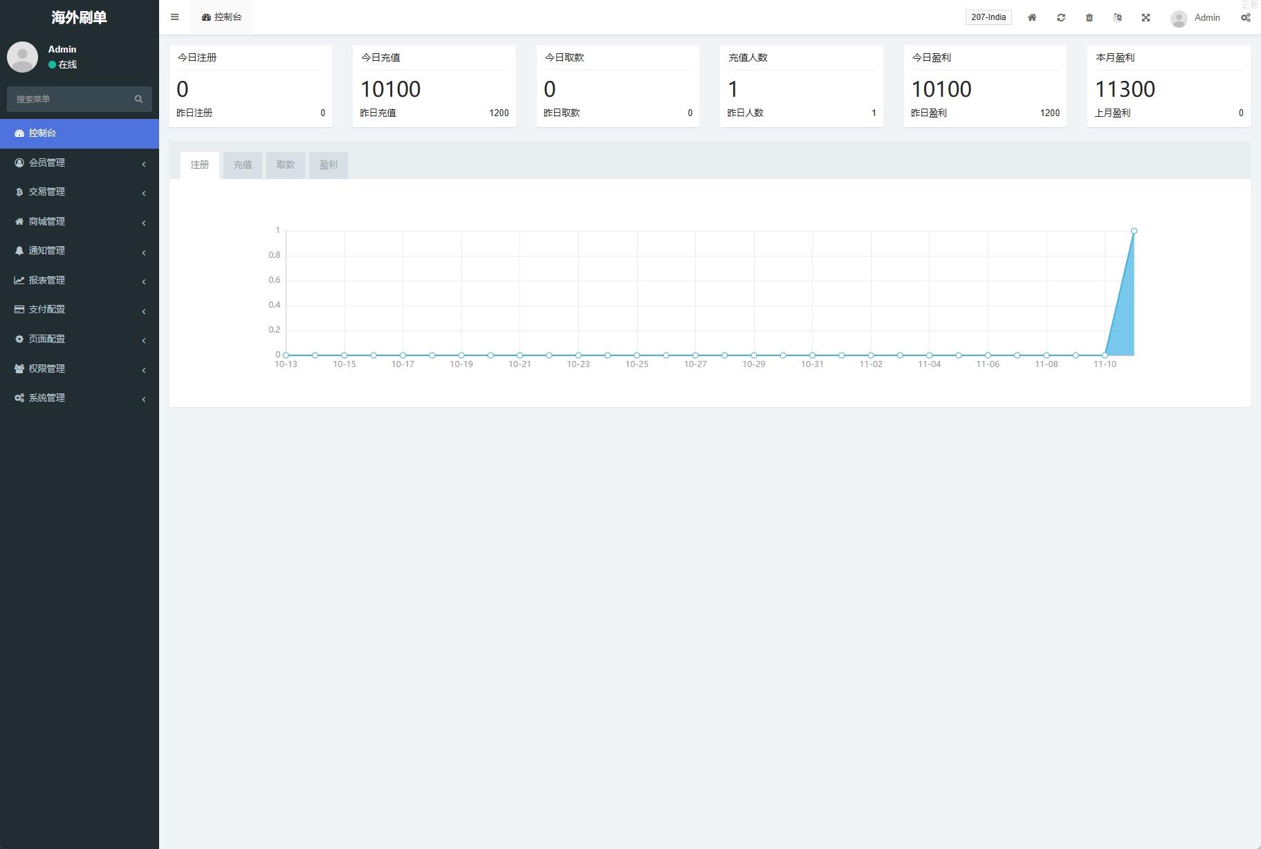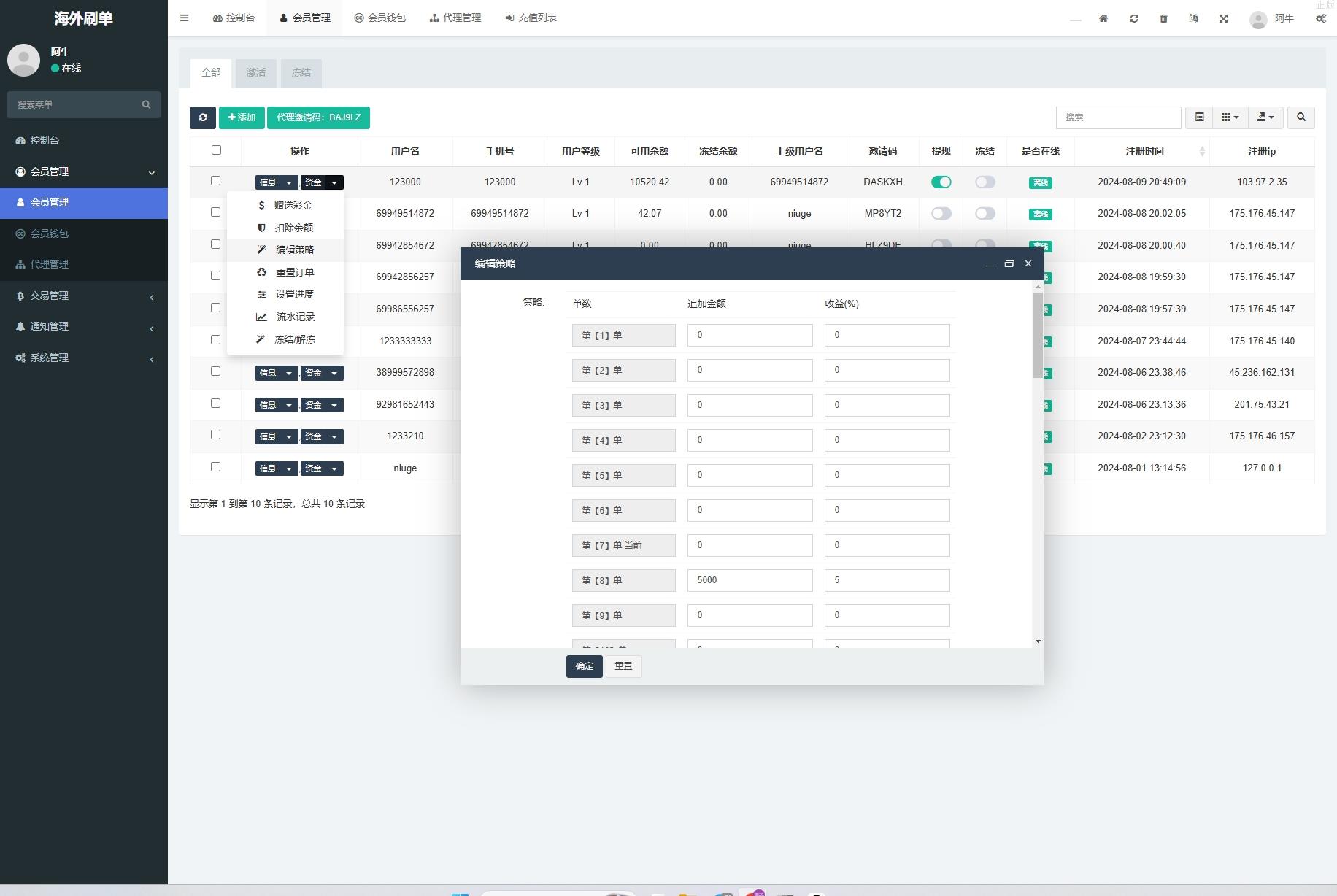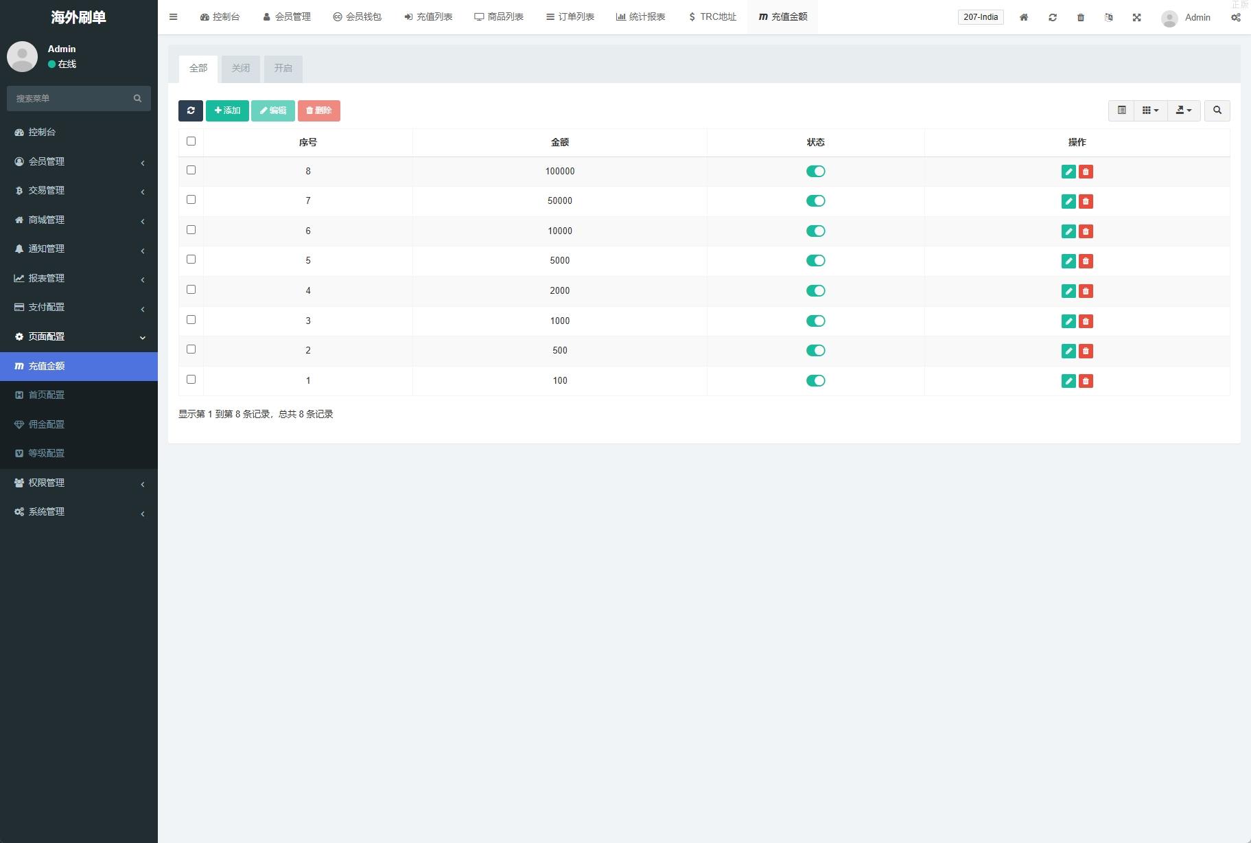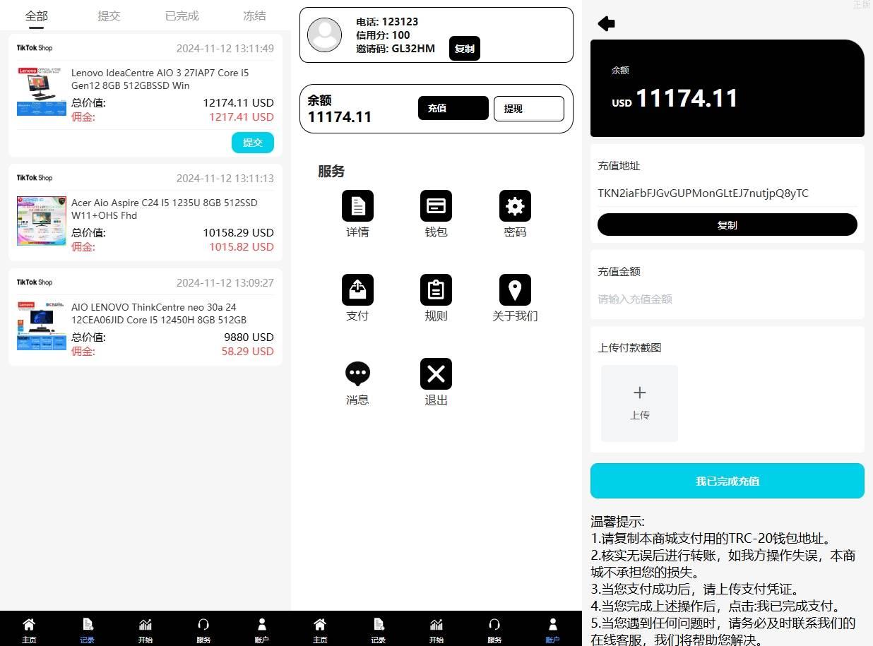 亲测多國語言TikTok抢单刷單系统/40单任务快杀盘/前端VUE 前端vue开发10国语言后端php全开源带教程 系统核心指派订单: 自由设置每一个订单的金额及佣金比例,亦可直接设置1-40单;若设置的订单金额超过用户余额,则显示:请充值XXX元,以获得佣金XXX元。 支持设置用户信用分; 支持设置新用户注册送; 支持单独设置某用户禁止提现,或冻结; 支持权限代理后台