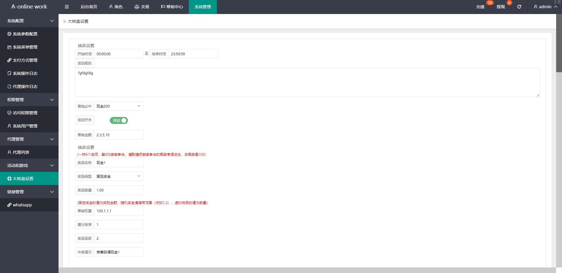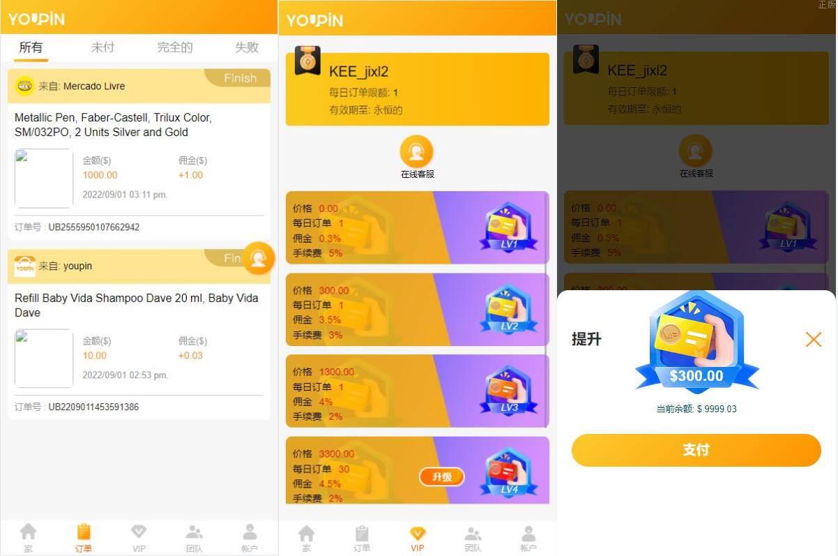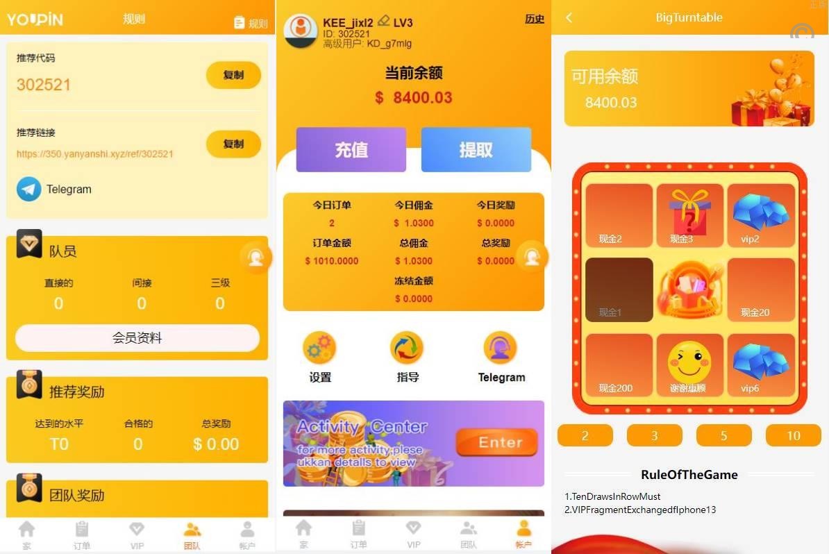 多國語言特惠抢单刷單源码/大转盘抽奖余利宝/代理后台/订单自动匹配 多國語言特惠抢单刷單系统/大转盘抽奖余利宝/代理后台/订单自动匹配 此套系统前端从新涉及UI,非市场大众UI 源码支持多种语言,默认是屏蔽了几个需要自己注释下 系统新增了多个小功能如单独代理后台、预约排单、自动抢单、利息宝、升级VIP送礼金、大转盘抽奖等